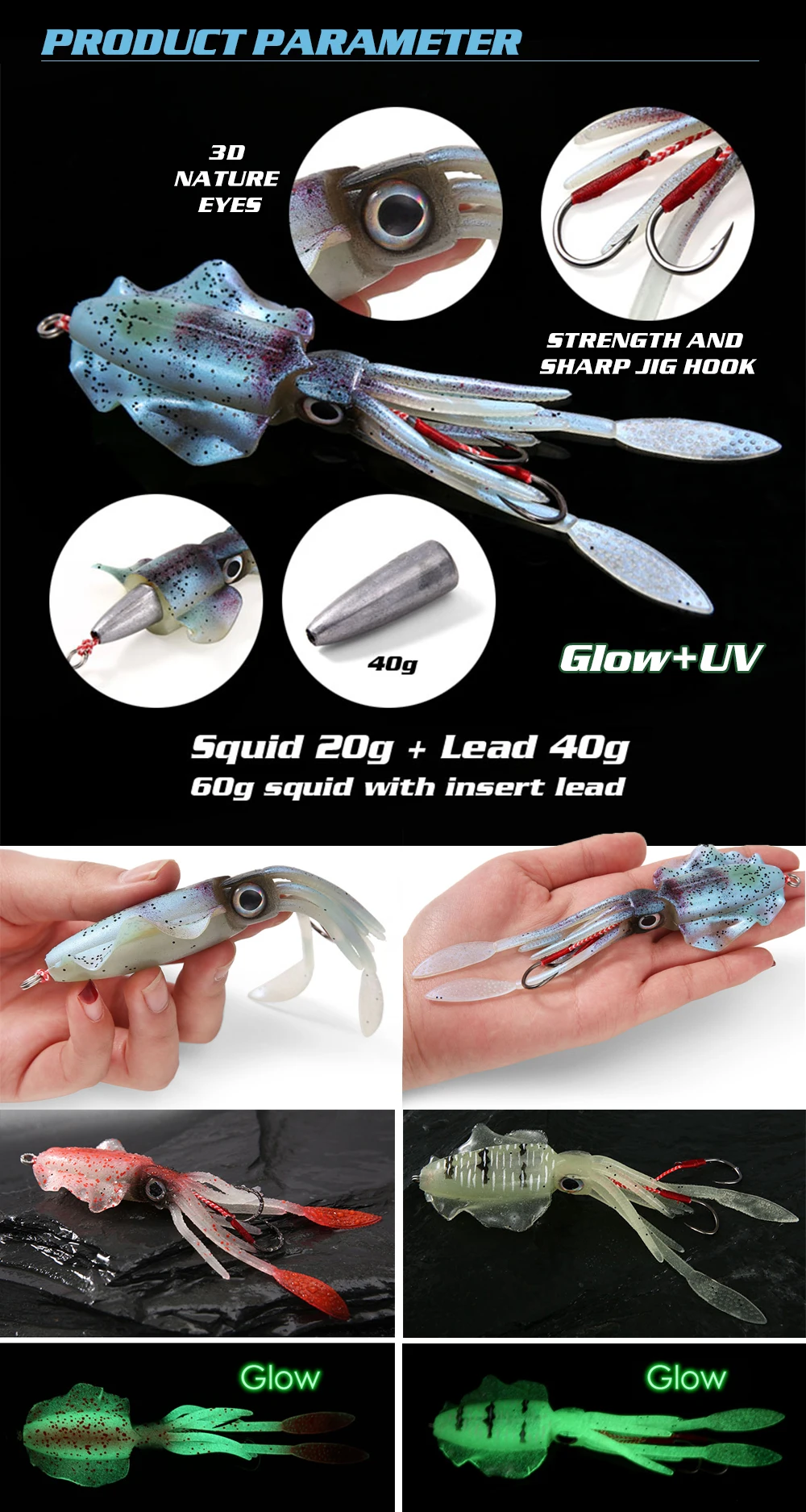 Peso total: 20g(20g señuelo de calamar sin plomo ni anzuelo)/60g (calamar 20G + plomo 40g).