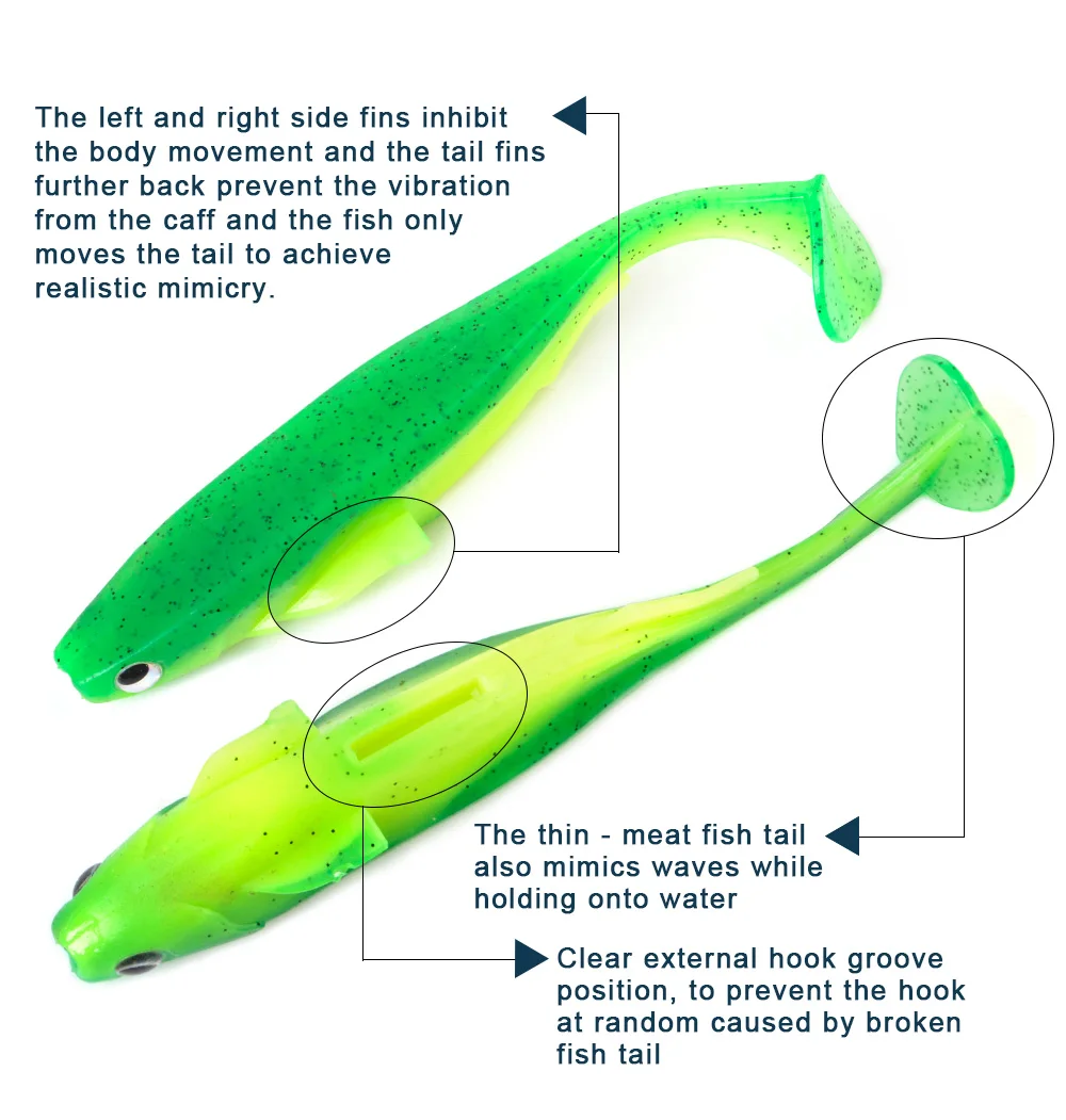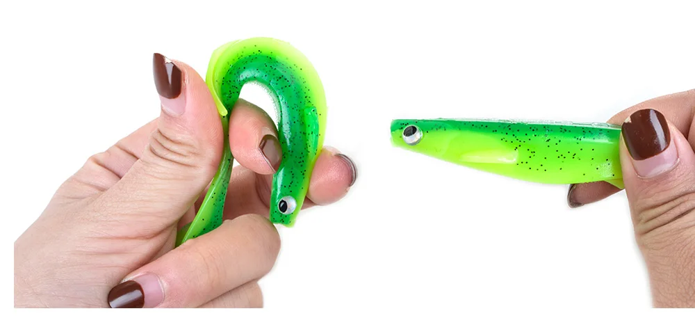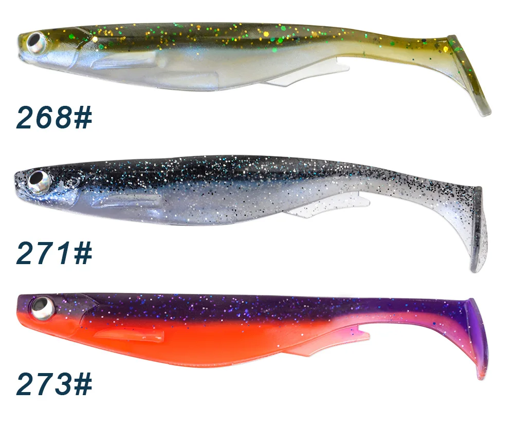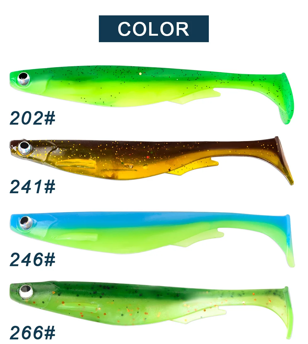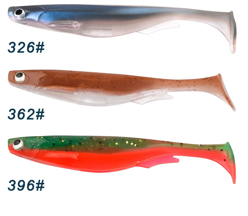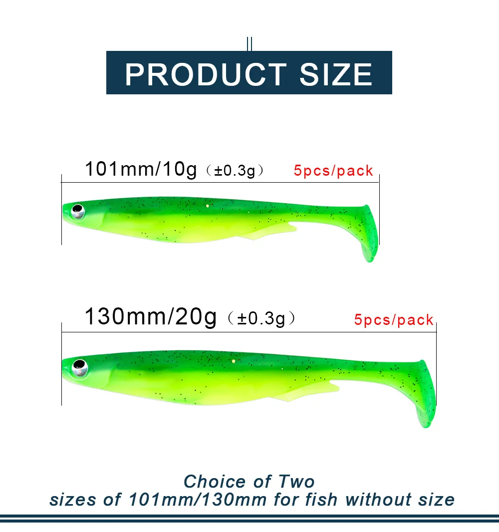 FTK 5 uds señuelo de pesca suave Spark Shad 3D Eye señuelo suave 101mm 130mm Wobblers cebo de silicona cola en T para lubina