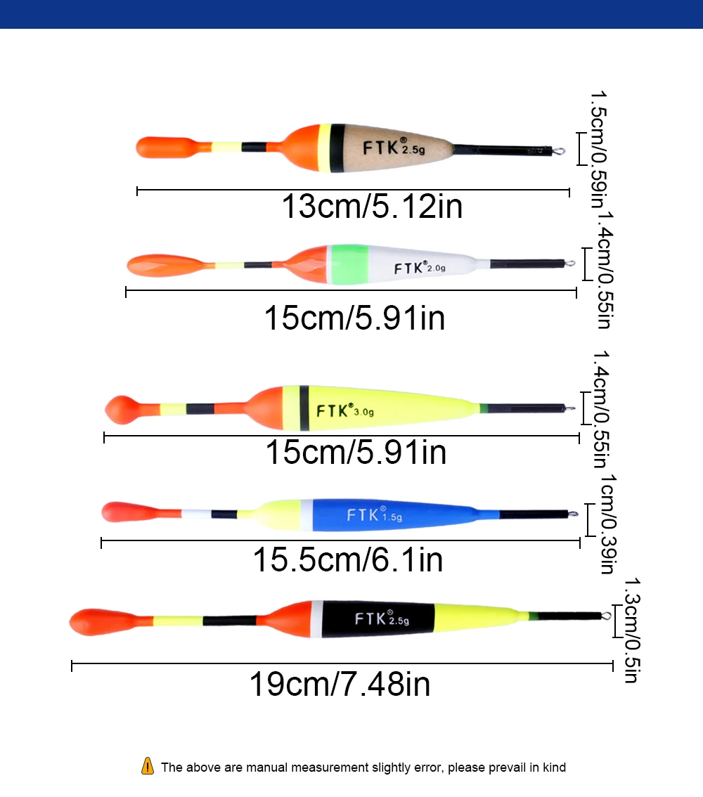 FTK-Juego de flotadores de pesca, flotador de abeto Barguzinsky, 1,5/2/2, 5/3g, boya flotante de colores de tamaño mixto para accesorios de pesca de carpa, 13cm-19cm, 5 uds.