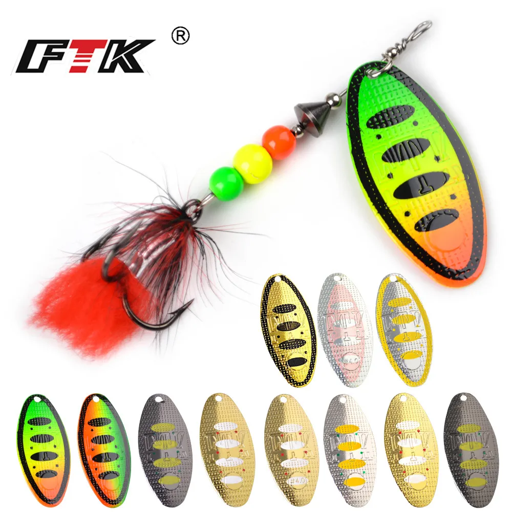 FTK-señuelo de pesca giratorio, cebo duro, señuelos de cuchara, Metal con pluma, anzuelos triples, carpa, Lucio, aparejos de pesca, 1 pieza, 8g, 14g, 20g