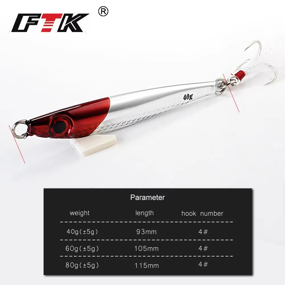 FTK-señuelo de pesca con plantilla de Metal, 40G, 60G, 80G, ojo 3D, cebo Artificial duro con anzuelos triples, señuelo de Jigging, lubina, accesorios de pesca de mar
