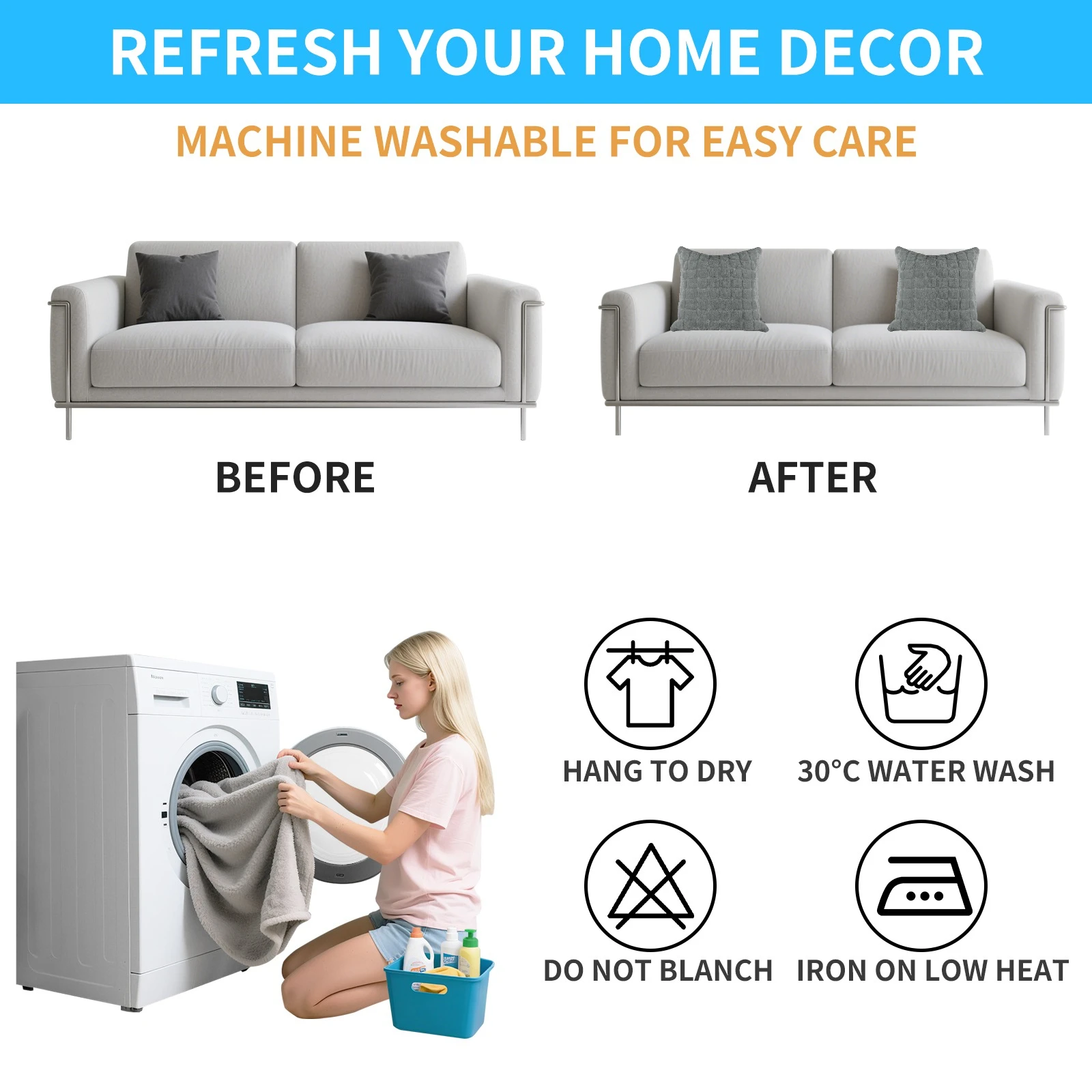Fácil limpieza y cuidado: lavar a máquina (en frío) y secar (en frío). No usar lejía. Fundas lavables Mantienen la suavidad y el color después del lavado.