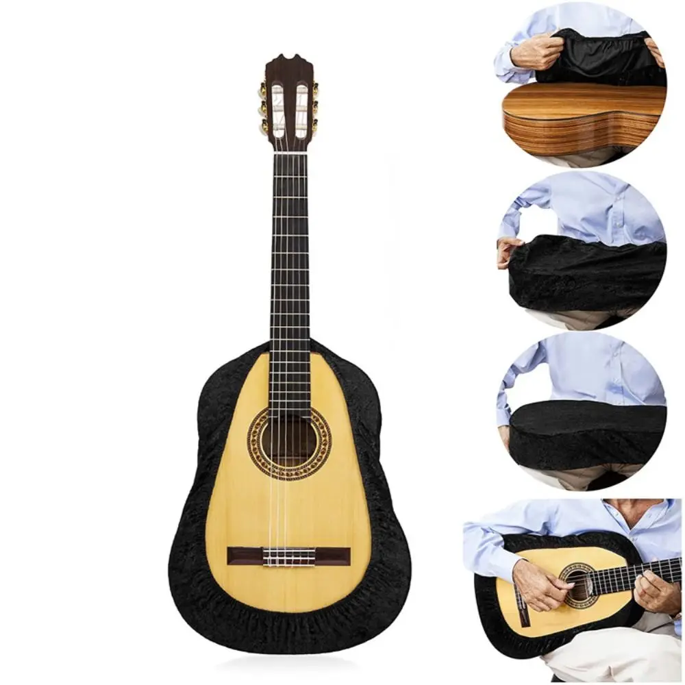 Tipo: cubierta antipolvo de guitarra. Material: tela elástica. Color: negro. Tamaño: 45*34cm (17,72*13.39in). El paquete incluye: 1 cubierta antipolvo de guitarra de 1 ". Descripción. Este producto puede proteger su guitarra. No dejará que nada dañe su guitarra y su sonido. Puede proteger su guitarra de golpes, arañazos, sudor, cambios de temperatura. Simple y fácil de usar, Simplemente deslice la cubierta hacia la parte posterior del instrumento, hasta que toda la parte posterior y parte de la parte superior estén cubiertas. La cubierta antipolvo es adecuada para guitarra popular, guitarra clásica, guitarra eléctrica, bajo eléctrico. Nota: 1. Debido a las diferentes configuraciones de pantalla, el producto real puede tener un pequeño error de color. 2. El tamaño se mide manualmente, hay un pequeño error, Por favor comprenda