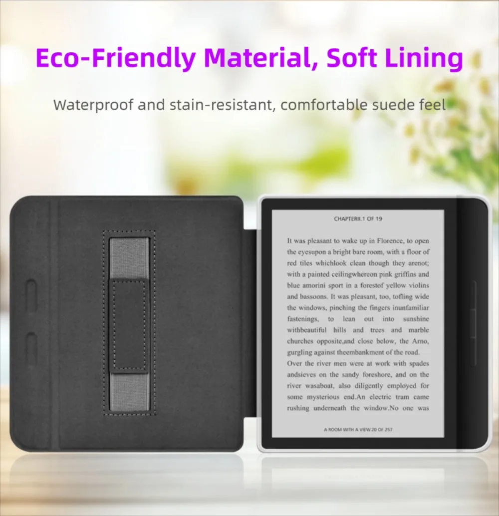 - Soporte de mano incorporado: el estuche cuenta con una correa de mano incorporada que proporciona un agarre seguro y cómodo, lo que facilita sostener su eReader para sesiones de lectura prolongadas.La correa de mano ergonómica reduce la fatiga de la mano y mejora la comodidad de lectura.