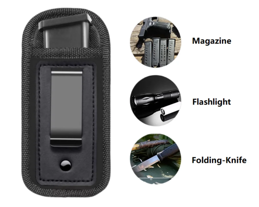 Dimensión exterior: 16cm * 7,5 cm. Se adapta a modelos grandes de doble pila de 9mm y 40mm como Glock 19, 21, 22, 23, Ruger SR40, tamaño completo XD, Beretta.