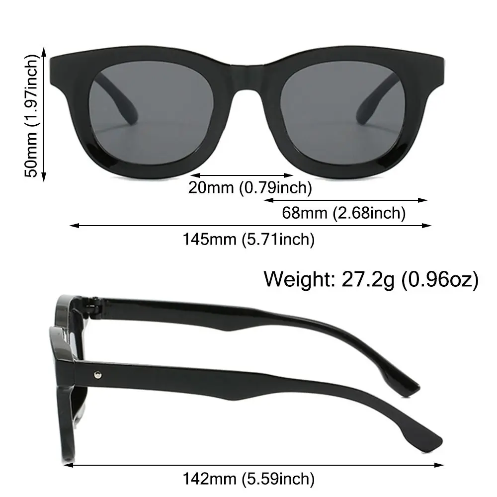 Product Name: Popular Jelly Green Sunglasses Style: Retro Fashion Color: 7 Colors for your choice Lens Material: Polycarbonate Frame Material: PC Polarization Type: Non-Polarized Product Size: Total Width: 145mm (5.71inch) Frame Width: 68mm (2.68inch) Frame Height: 50mm (1.97inch) Nose Bridge Width: 20mm (0.79inch) Temples Length: 142mm (5.59inch) Weight: 27.2g (0.96oz) Package Included: 1 x Sunglasses Note: 1. There is a 2-3% difference according to manual measurement. Please check the size carefully before you buy the item. 2. Please note that a slight color difference should be acceptable due to the light and screen.