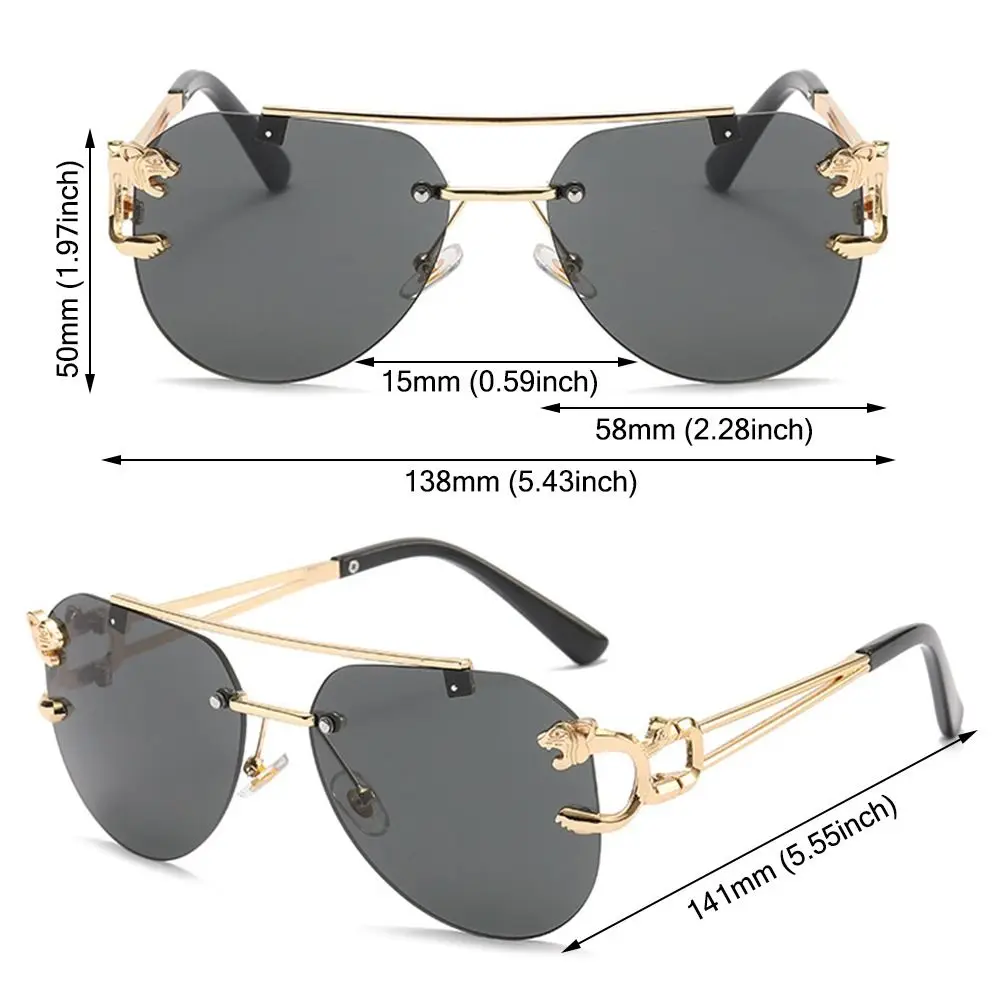 Nombre del producto: gafas de sol sin montura con decoración de guepardo vintage Estilo: moda, moda retro Color: negro, gris degradado, Té degradado, azul degradado, rojo Amarillo, Azul amarillo, material de lente cian degradado: material del marco de policarbonato: PC, tipo de polarización de metal: tamaño del producto no polarizado: ancho total: 138mm (5,43 pulgadas) Ancho de la lente: 58mm (2,28 pulgadas) Altura de la lente: 50mm (1,97 pulgadas) Ancho del puente nasal: 15mm (0,59 pulgadas) de las patillas Longitud: 141mm (5,55 pulgadas) El paquete incluye: 1 x Gafas de sol Nota: 1. Hay una diferencia de 2 a 3% según la medición manual. Por favor, compruebe la talla cuidadosamente antes de comprar el artículo. 2. Tenga en cuenta que una ligera diferencia de color debe ser aceptable debido a la luz y la pantalla.