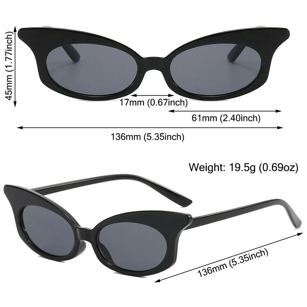 Nombre del producto: Gafas de sol con forma de mariposa pequeña Estilo: moda, moda Retro Color: 7 colores para su elección Material de la lente: PC Material del marco: PC Tipo de polarización: No polarizado Tamaño del producto: Ancho total: 136mm (5,35 pulgadas) Ancho del marco: 61mm (2,40 pulgadas) Altura del marco: 45mm (1,77 pulgadas) Ancho del Puente de la nariz: 17mm (0,67 pulgadas) Longitud de las patillas: 136mm (5,35 pulgadas) Peso: 19,5g (0,69 oz) Paquete incluido: 1 x gafas de sol Nota: 1. Hay una diferencia de 2 a 3% según la medición manual. Compruebe cuidadosamente la talla antes de comprar el artículo. 2. Tenga en cuenta que una ligera diferencia de color debe ser aceptable debido a la luz y la pantalla.