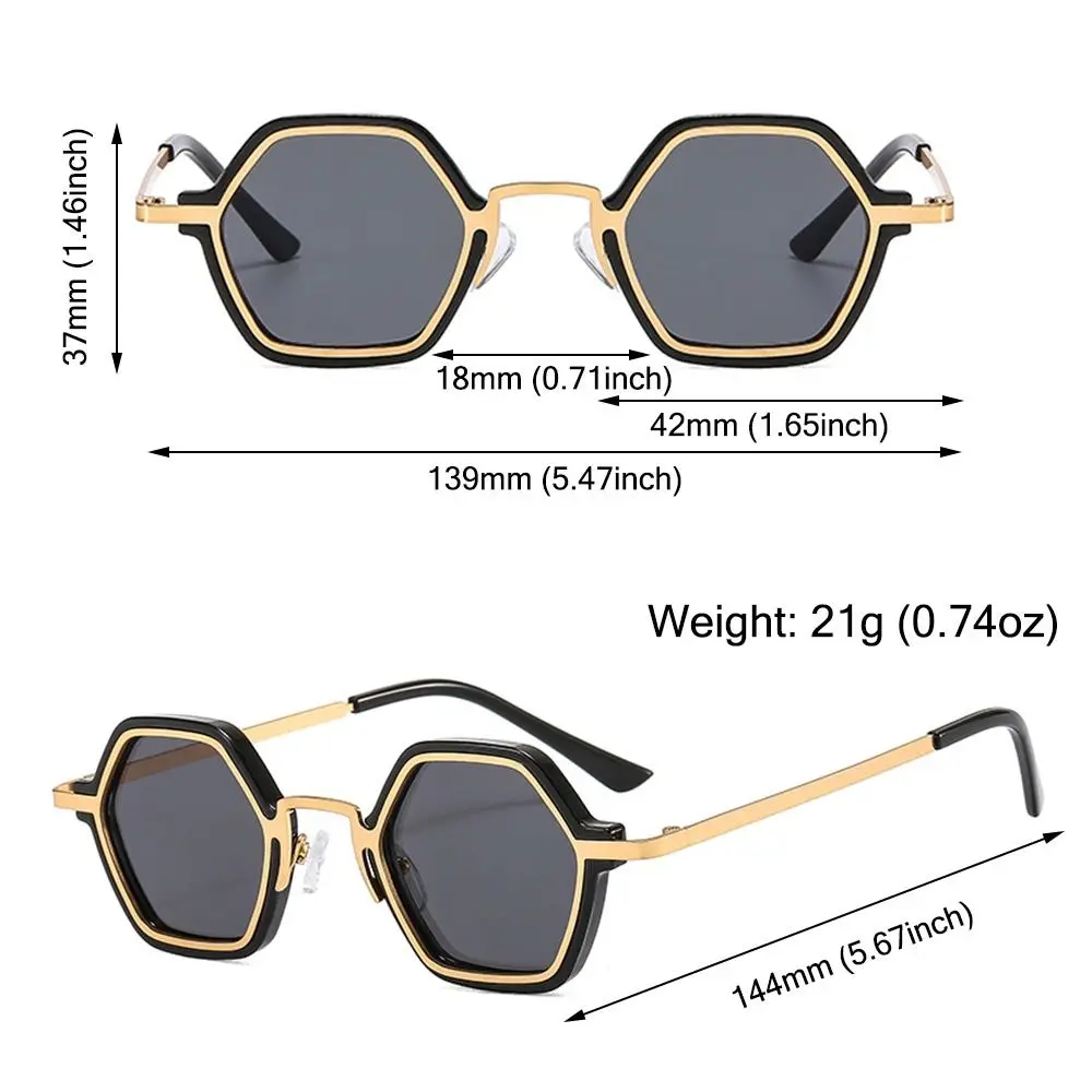 Product Name: Small Frame Polygonal Sunglasses Style: Retro Fashion Color: 10 Colors for your choice Lens Material: Polycarbonate Frame Material: PC, Metal Polarization Type: Non-Polarized Product Size: Total Width: 139mm (5.47inch) Frame Width: 42mm (1.65inch) Frame Height: 37mm (1.46inch) Nose Bridge Width: 18mm (0.71inch) Temples Length: 144mm (5.67inch) Weight: 21g (0.74oz) Package Included: 1 x Sunglasses Note: 1. There is a 2-3% difference according to manual measurement. Please check the size carefully before you buy the item. 2. Please note that a slight color difference should be acceptable due to the light and screen.