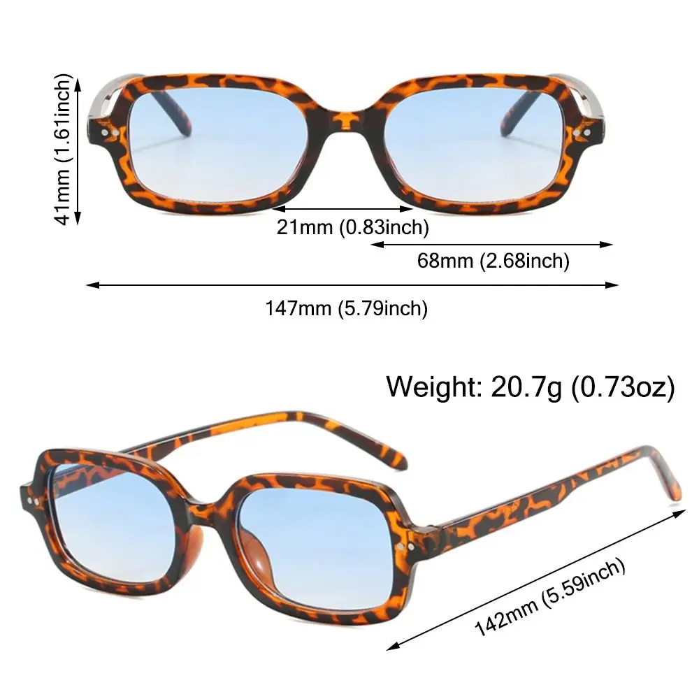 Nombre del producto: Gafas Estilo rectangulares de Sol: moda retro Color: 9 colores para su elección Material de la lente: policarbonato Material del marco: PC Tipo de polarización: No polarizado Tamaño del producto: ancho total: 147mm (5,79 pulgadas) Ancho del marco: 68mm (2,68 pulgadas) Altura del marco: 41mm (1,61 pulgadas) Ancho del Puente de la nariz: 21mm (0,83 pulgadas) Longitud de las patillas: 142mm (5,59 pulgadas) Peso: 20,7G (0,73 oz) El paquete incluye: 1 x gafas de sol Nota: 1. Hay una diferencia de 2 a 3% según la medición manual. Comprueba la talla cuidadosamente antes de comprar el artículo. 2. Tenga en cuenta que una ligera diferencia de color debe ser aceptable debido a la luz y la pantalla.