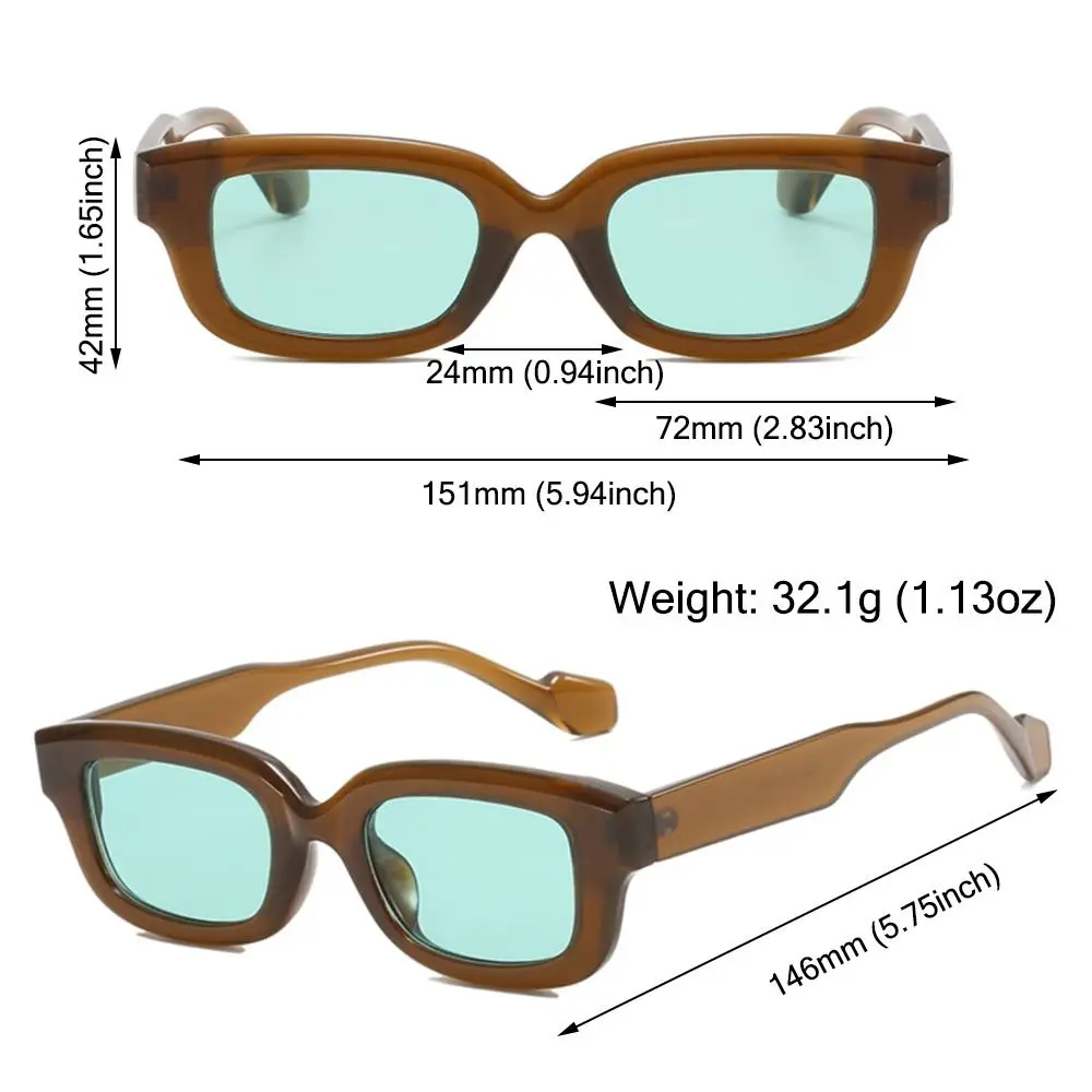 Nombre del producto: gafas de sol rectangulares pequeñas Estilo: moderno, Retro Color: 8 colores para su elección Material de la lente: policarbonato Material del marco: PC Tipo de polarización: No polarizado Tamaño del producto: ancho total: 151mm (5,94 pulgadas) Ancho del marco: 72mm (2,83 pulgadas) Altura del marco: 42mm (1,65 pulgadas) Ancho del puente nasal: 24mm (0,94 pulgadas) de las patillas Longitud: 146mm (5,75 pulgadas) Peso: 32,1G (1,13 oz) incluido Paquete: 1 x Gafas de sol Nota: 1. Hay una diferencia de 2 a 3% según la medición manual. Compruebe cuidadosamente la talla antes de comprar el artículo. 2. Tenga en cuenta que una ligera diferencia de color debe ser aceptable debido a la luz y la pantalla.