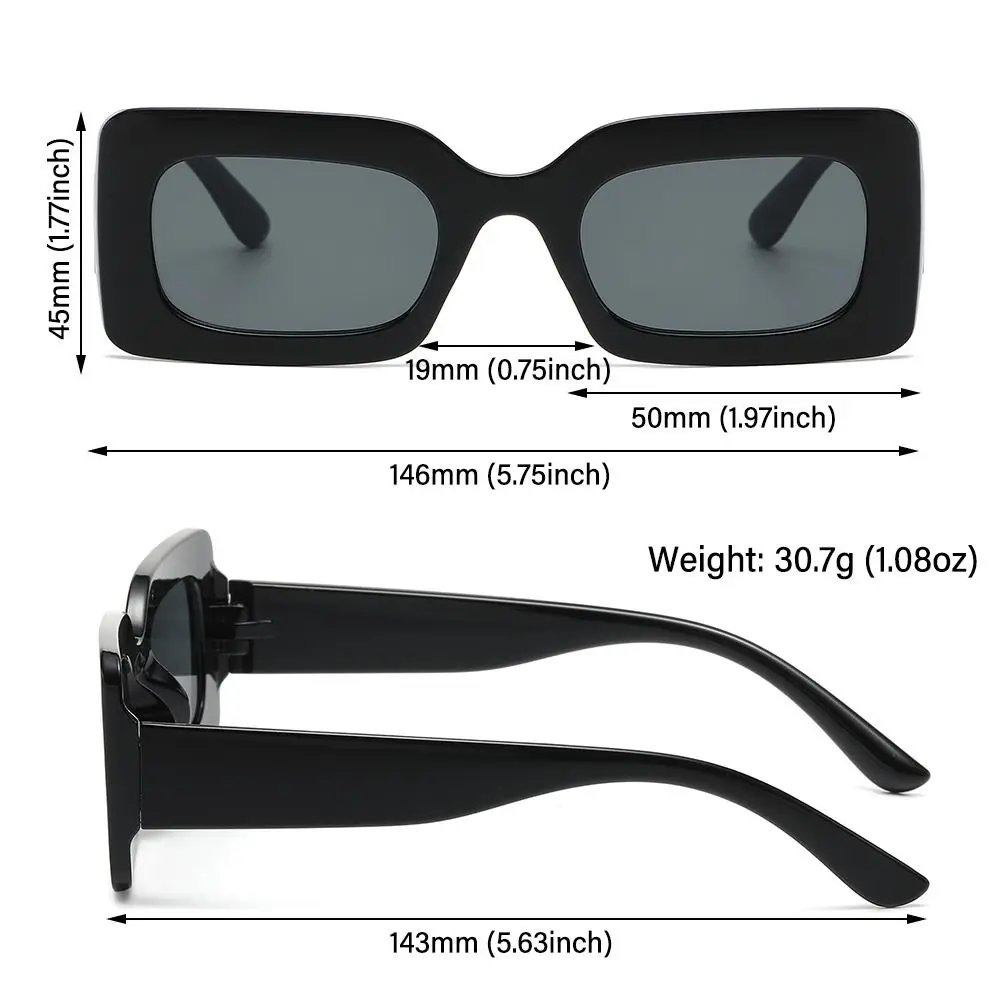 Nombre del producto: gafas de sol rectangulares retro Estilo: moda, moda Color retro: 17 colores para su elección Material de la lente: policarbonato Material del marco: PC Tipo de polarización: No polarizado Tamaño del producto: ancho total: 146mm (5,75 pulgadas) Ancho del marco: 50mm (1,97 pulgadas) Altura del marco: 45mm (1,77 pulgadas) Ancho del Puente de la nariz: 19mm (0,75 pulgadas) de patillas Longitud: 143mm (5,63 pulgadas) Peso: 30,7G (1,08 oz) incluido Paquete: 1 x Gafas de sol Nota: 1. Hay una diferencia de 2 a 3% según la medición manual. Por favor, Compruebe el tamaño cuidadosamente antes de comprar el artículo. 2. Tenga en cuenta que una ligera diferencia de color debe ser aceptable debido a la luz y la pantalla.