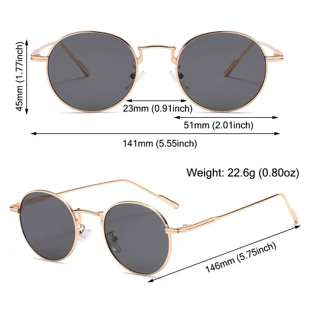 Nombre del producto: gafas de sol redondas de montura pequeña Estilo: oro-negro, oro-rosa gris, negro-negro, oro-marrón Color: colores para su elección Material de la lente: policarbonato Material de la montura: tipo de polarización de metal: No polarizado Tamaño del producto: Ancho total: 141mm (5,55 pulgadas) Ancho del marco: 51mm (2,01 pulgadas) Altura del marco: 45mm (1,77 pulgadas) Ancho del puente nasal: 23mm (0,91 pulgadas) de las patillas Longitud: 146mm (5,75 pulgadas) Peso: 22,6G (0,80 oz) incluido Paquete: 1 x Gafas de sol Nota: 1. Hay una diferencia de 2 a 3% según la medición manual. Por favor, Compruebe el tamaño cuidadosamente antes de comprar el artículo. 2. Tenga en cuenta que una ligera diferencia de color debe ser aceptable debido a la luz y la pantalla.