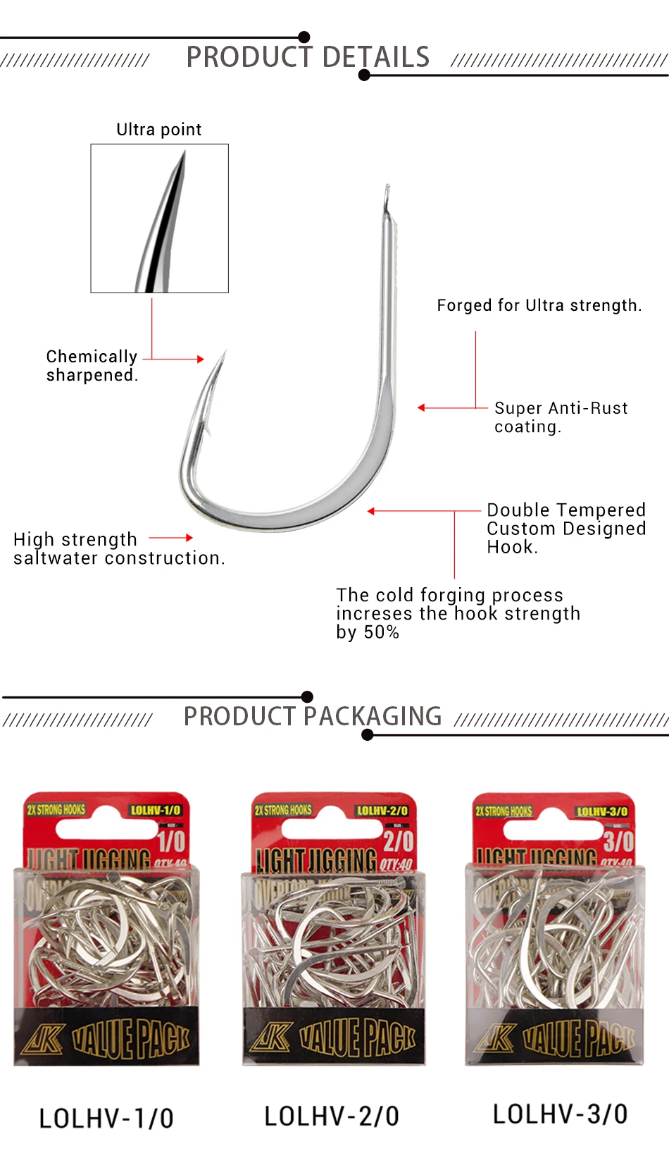 JK LOLHV Jigging Hook está construido fuerte con su área templada específica en el vástago. Están diseñados para ser increíblemente fuertes y el punto de gancho está en ángulo para la penetración de Punto más eficiente.