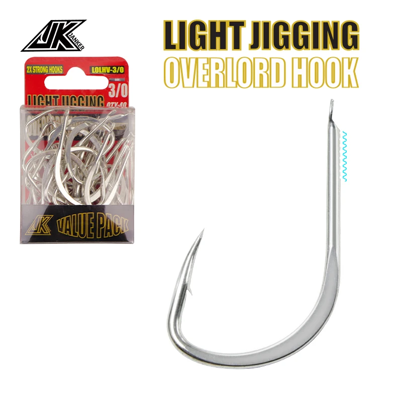 JK LOLHV Jigging Hook está construido fuerte con su área templada específica en el vástago. Están diseñados para ser increíblemente fuertes y el punto de gancho está en ángulo para la penetración de Punto más eficiente.