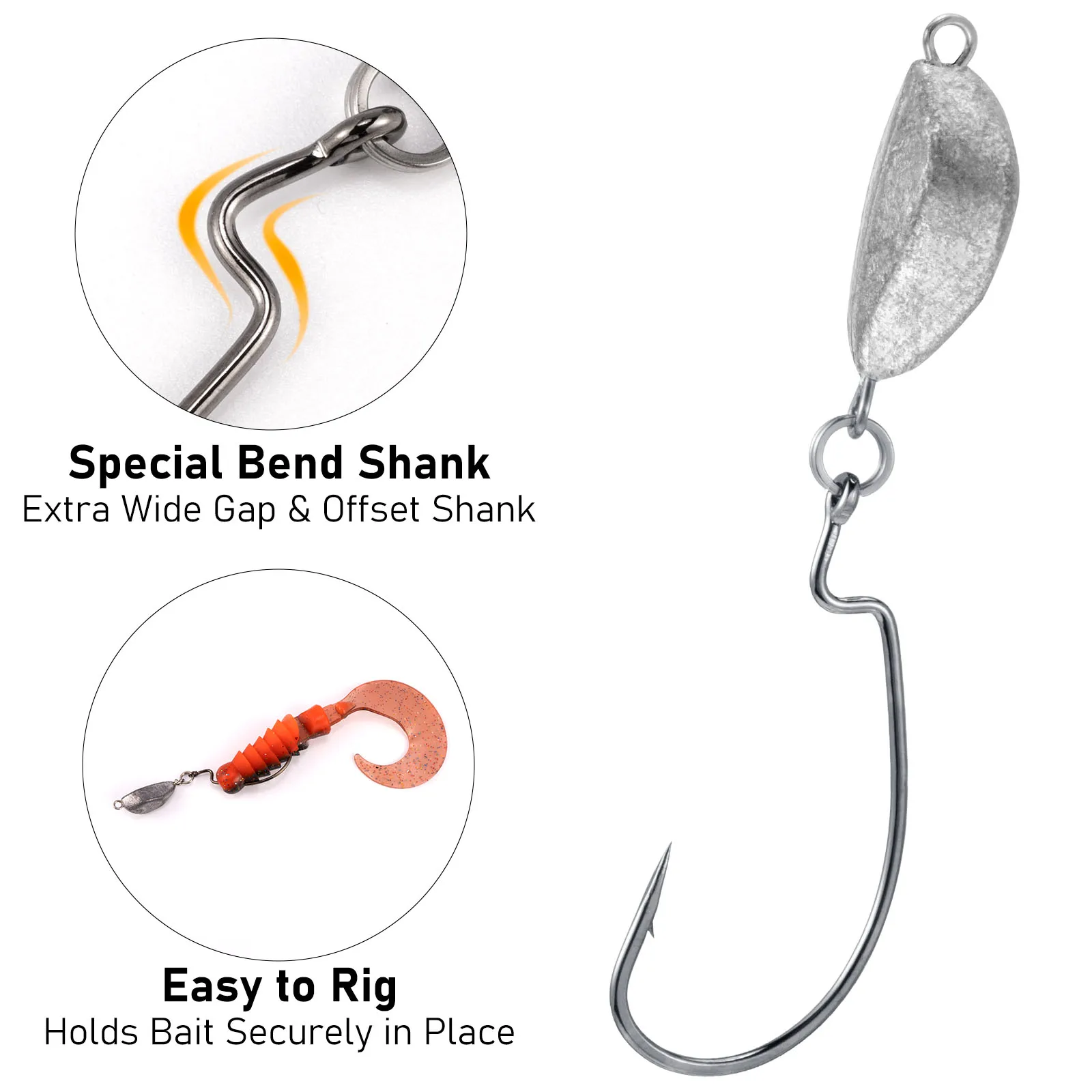 3.Ganchos desplazados de alto rendimiento: los ganchos desplazados están hechos de acero con alto contenido de carbono, gancho súper fuerte con punta de aguja.Se puede utilizar para montar diferentes cebos blandos para la pesca de lubina, configurar rápidamente un aparejo de Texas y funciona bien para la pesca de lubina aparejada de Texas.