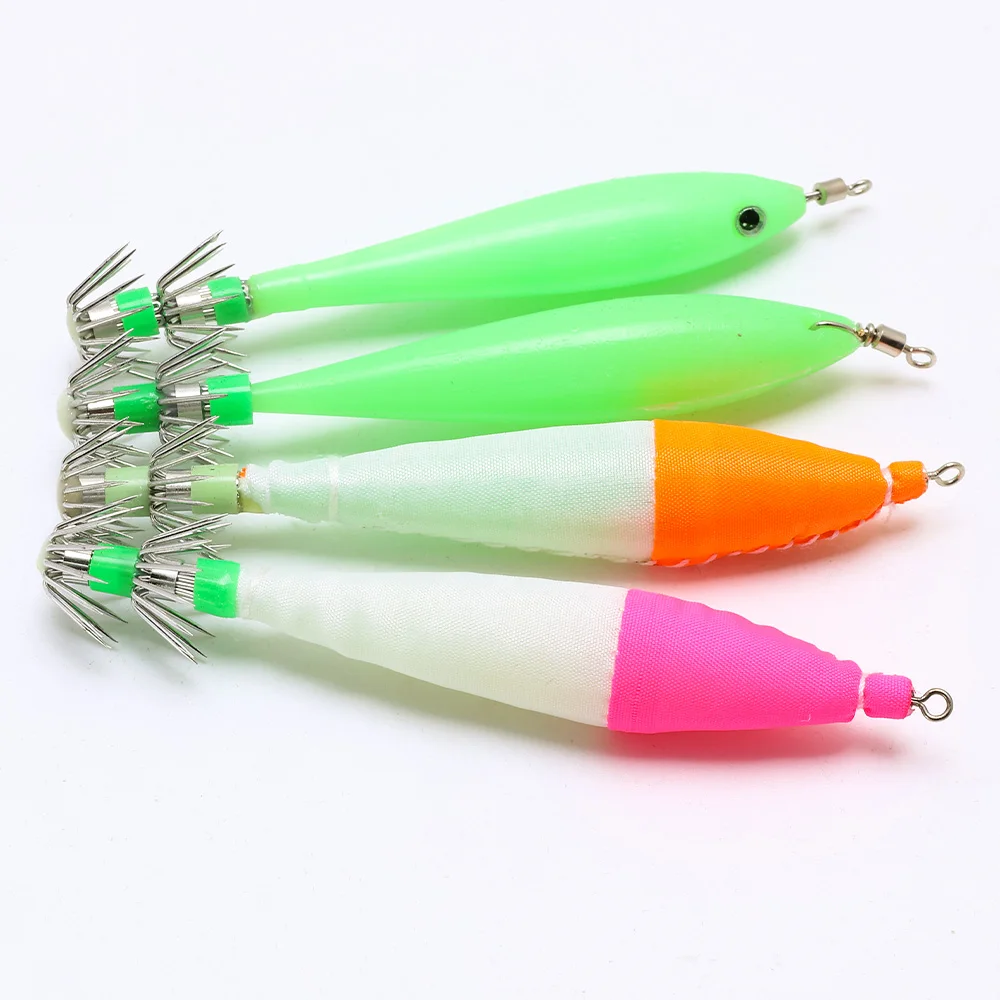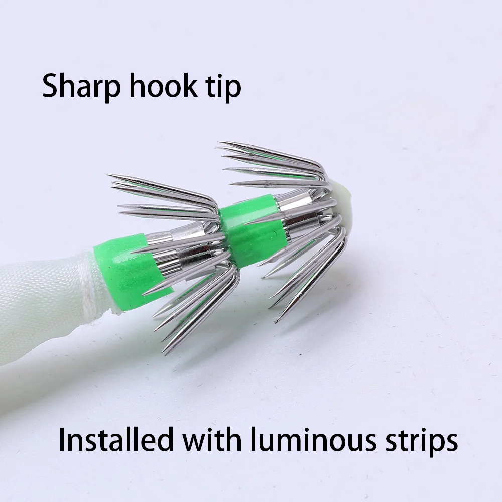 1. Diseño del producto: utiliza anzuelos de calamar de doble capa de alta calidad, que tienen menos probabilidades de caerse y son más duraderos al golpear peces.Bajo el efecto de luz nocturna, puede atraer bien a los peces en el agua y golpearlos con precisión.