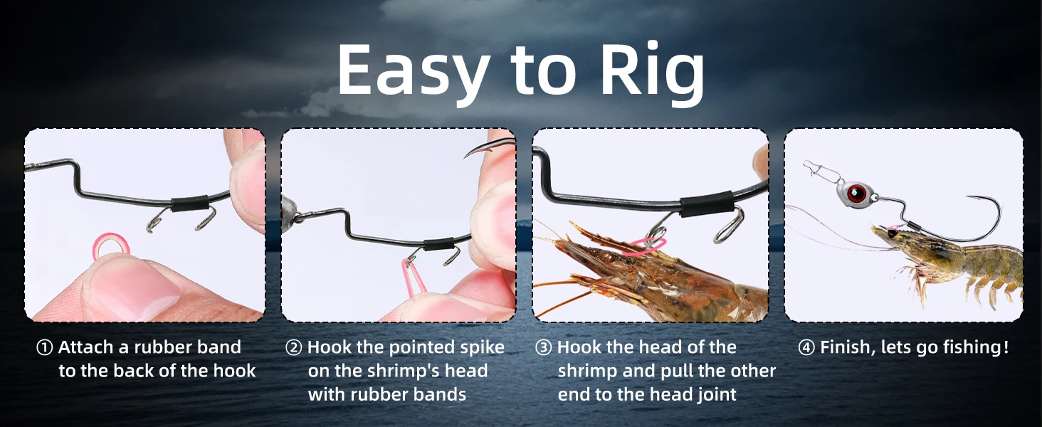 El anzuelo está inteligentemente diseñado para sujetarse de forma segura a las cáscaras de los camarones sin perforarlos ni dañarlos, lo que garantiza que permanezcan con la máxima vitalidad en el agua por más tiempo, haciéndolos más atractivos para los peces más grandes.