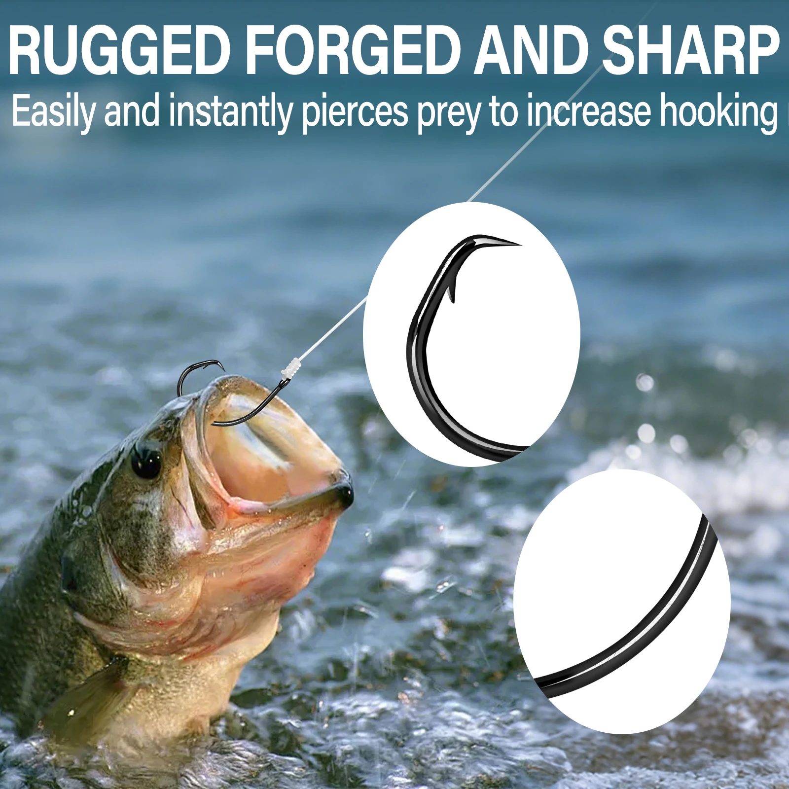 MATERIALES PREMIUM: Ganchos circulares de acero con alto contenido de carbono de alta calidad con acabado de níquel negro para mayor resistencia y mejor resistencia a la corrosión, lo que garantiza un rendimiento excelente tanto en entornos de pesca de agua dulce como salada.