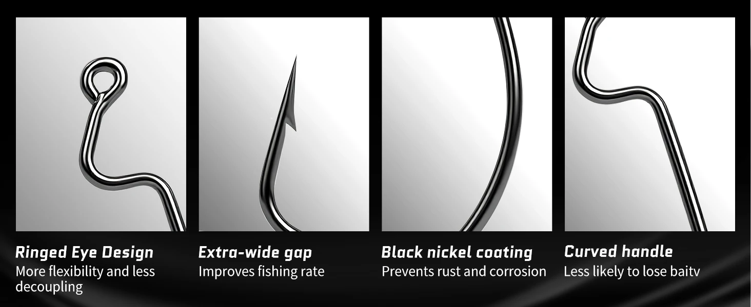 Estos ganchos brindan un amplio espacio para que el lubina y el lucio muerdan el anzuelo, mientras que la punta afilada garantiza una sujeción segura.
