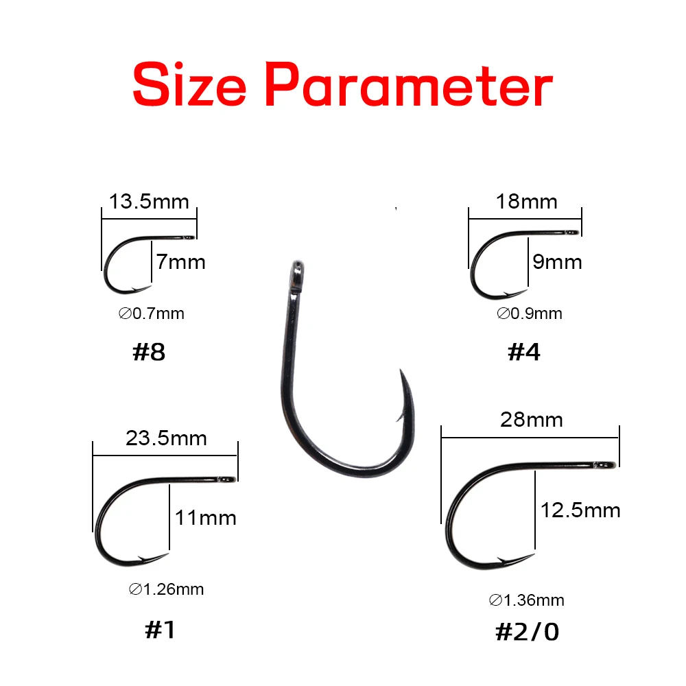 Especificaciones: Mosca de caza mayor de caña corta, cambiador de juego y ganchos de remolque y tubo; acabado de níquel negro, púas, ojo recto, 1X corto, 2X fuerza, espacio ancho, ultra afilado, acero de alto carbono, forjado.