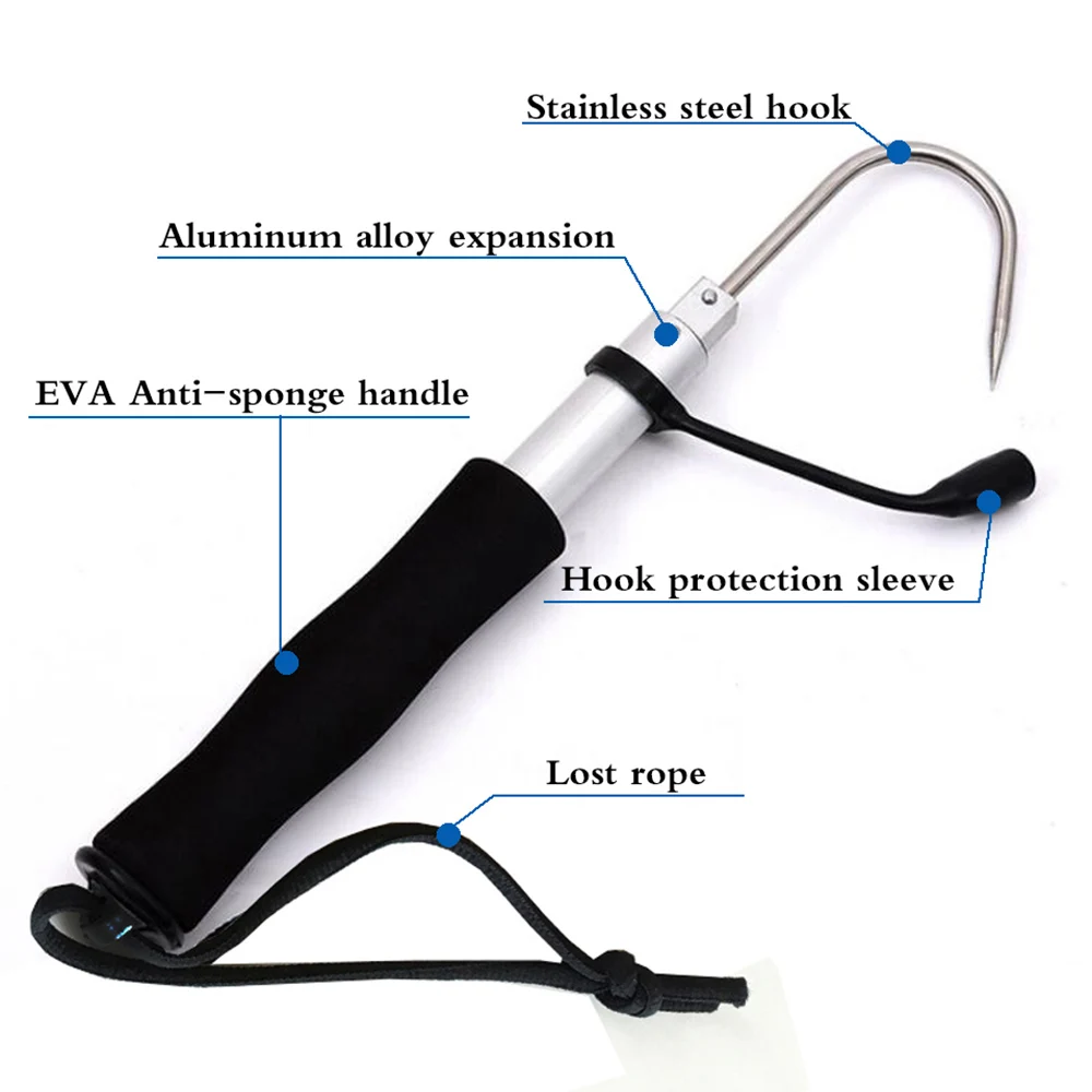 Este garfio de pesca está diseñado especialmente para pescadores. El gancho está hecho de acero inoxidable con cubierta protectora, es seguro. Es una herramienta esencial para especies de peces grandes y peces dentados peligrosos. El cuerpo está hecho de aleación de aluminio, es ligero pero lo suficientemente fuerte para peces grandes.Información básica