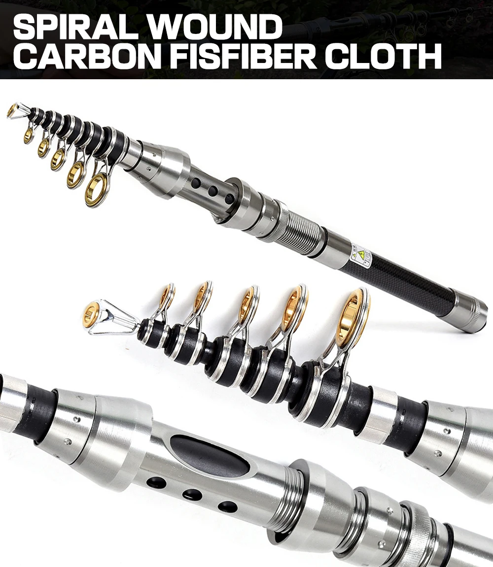 1. Esta caña de pescar está hecha de fibra de carbono, fuerte y duradera.