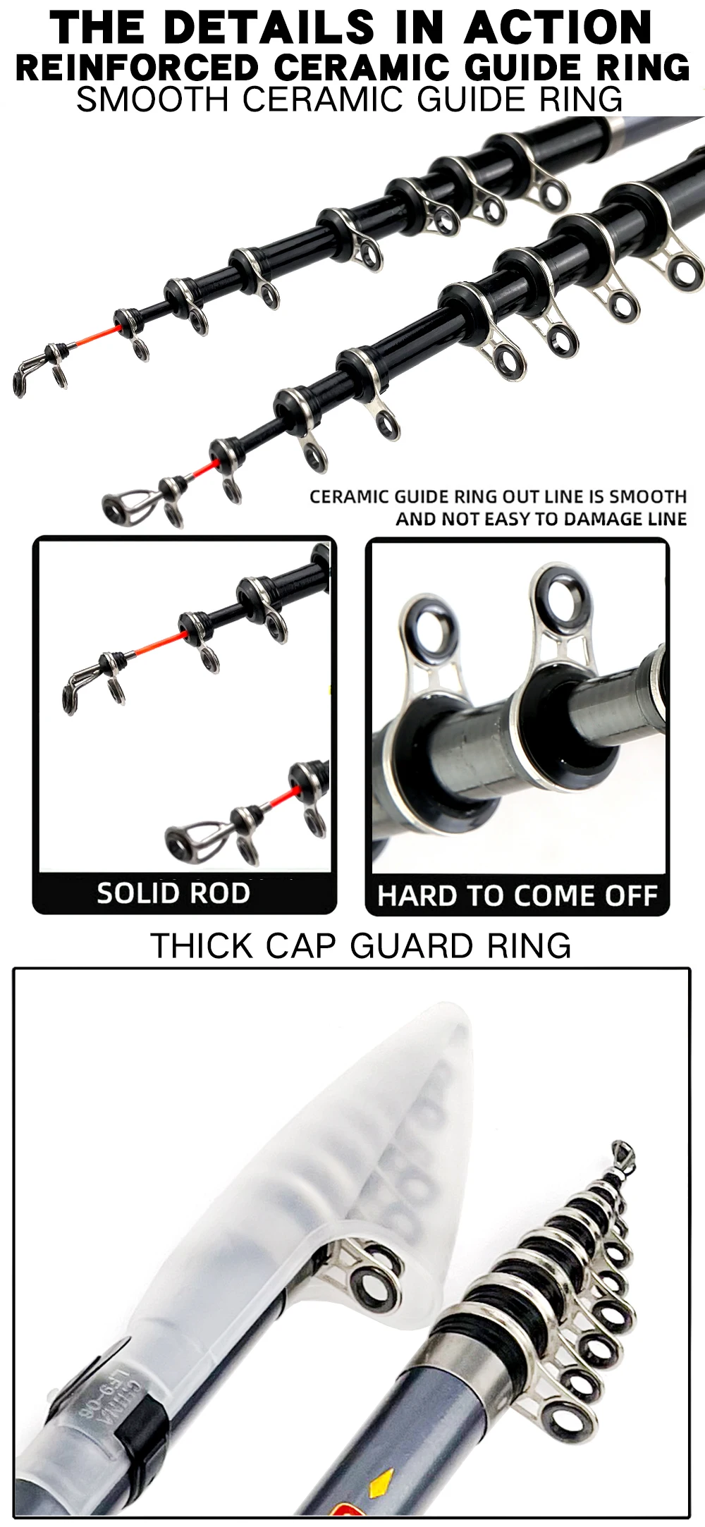Características:1. Esta caña de pescar está hecha de fibra de carbono, fuerte y duradera.2. Corto y mini, fácil de llevar.3. El más adecuado para la pesca desde la orilla, arrecifes y rocas en viajes y vacaciones.4. Un regalo ideal para entusiastas de la pesca o coleccionistas.5. Equipado con un anillo guía móvil, puede ubicarlo en cualquier lugar que sea mejor para su pesca.