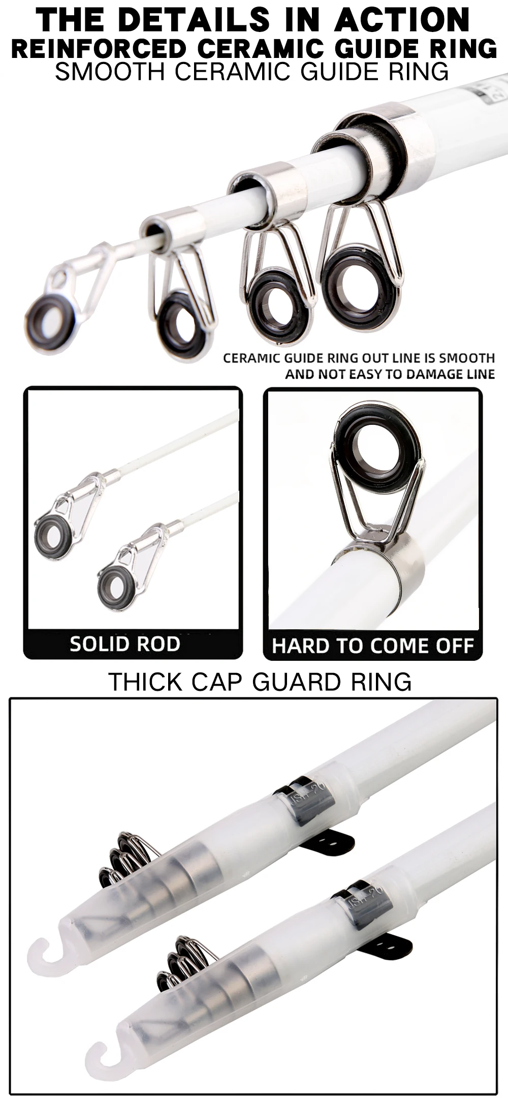 La longitud Real de 2,1 M es de 1,95 MLa longitud Real de 2,4 M es de 2,25 MLa longitud Real de 2,7 M es de 2,55 MLa longitud Real de 3,0 M es de 2,90 MLa longitud Real de 3,6 M es de 3,20 MCaracterísticas del producto1. Diseño de anillos grandes. Hecho de cerámica y envoltura de acero inoxidable, soldadura de una pieza, fuerte y suave.2. Asiento de carrete duradero. Es firme y fácil de fijar el carrete, no es fácil de caer.3. Exquisito trabajo de pintura.4. Cómodo mango de espuma. El diseño radial y absorbente del sudor mejora en gran medida la comodidad al luchar contra un pez y no se cansa durante mucho tiempo de pesca.Paquete incluido