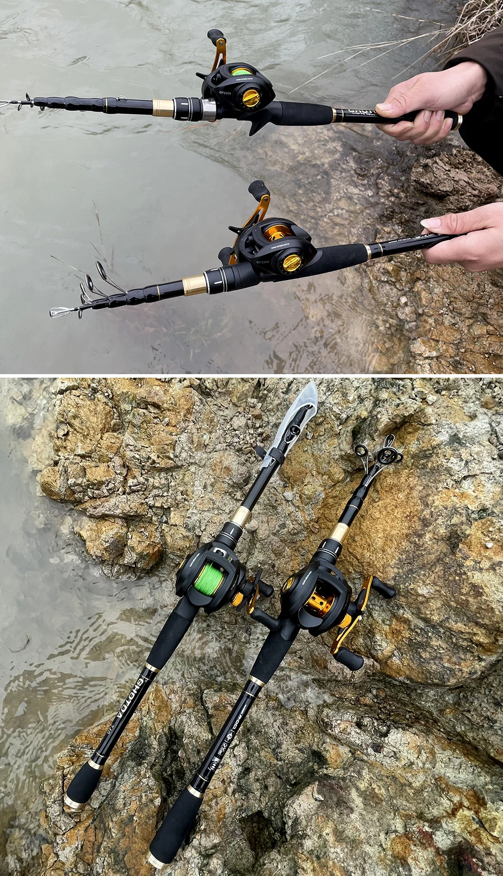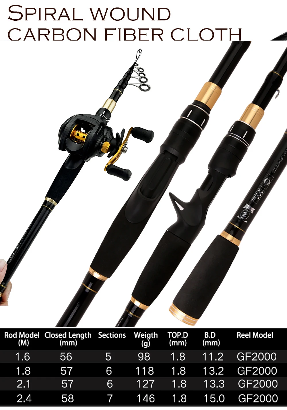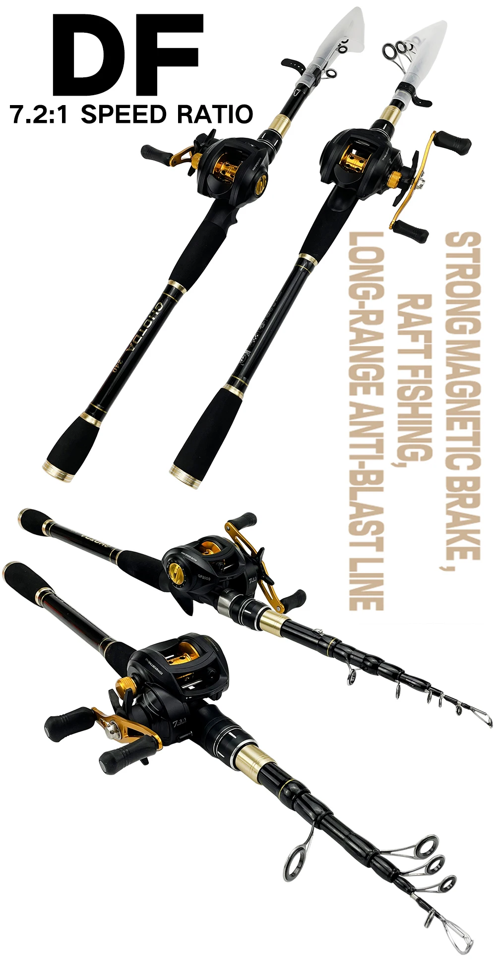 Caña de pescar de fibra de carbono y combos de carrete, caña de pescar giratoria de fundición portátil 17 + 1BB, juego de pesca de carrete Baitcasting