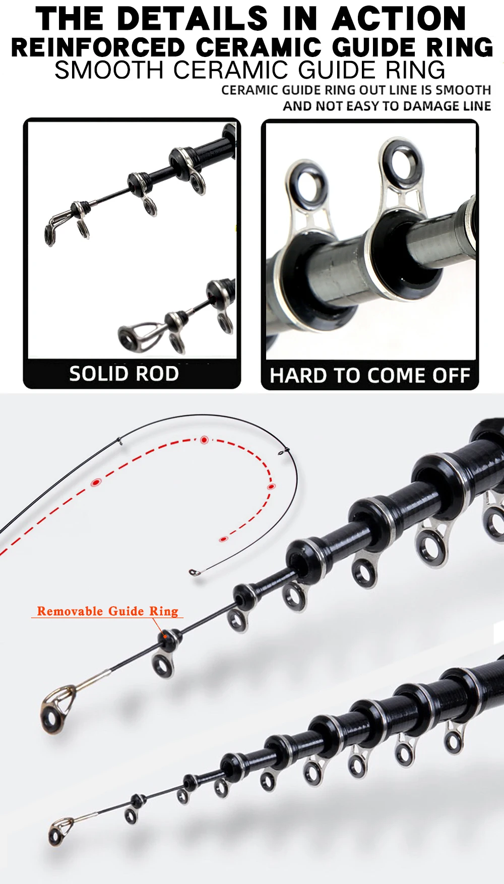 Ojo guía de cerámica, por lo que es suave y no daña su línea de pesca. Y está equipado con un anillo de guía móvil para evitar que la punta se rompa.
