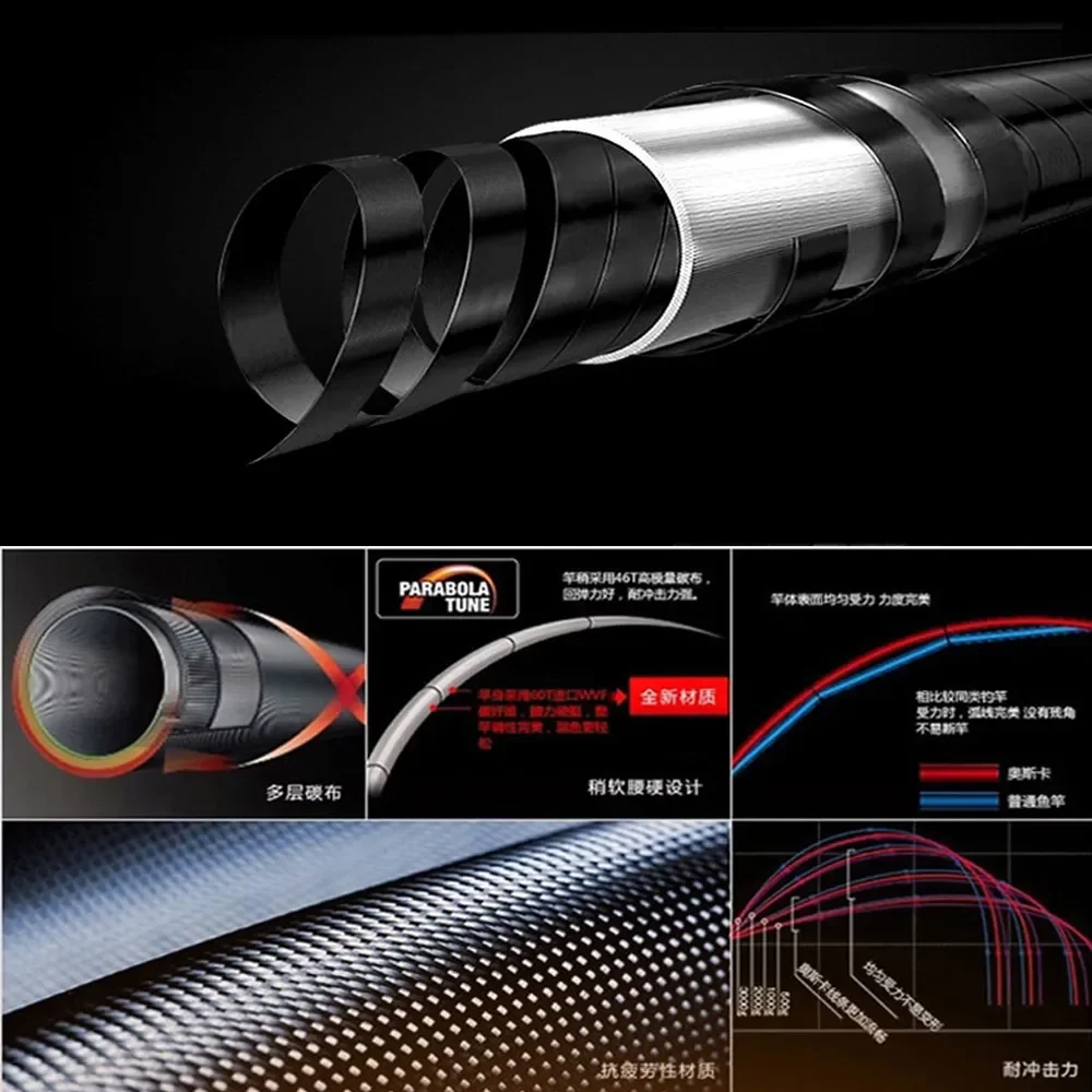 1. Con su diseño giratorio telescópico, esta caña de pescar viene en una gama de tamaños-2,7 M, 3,6 M, 4,5 M, 5,4 M, y 6,3 M, lo que lo hace ideal para su uso en diversos escenarios, incluidos estanques de depósito, océanos y pesca en roca.