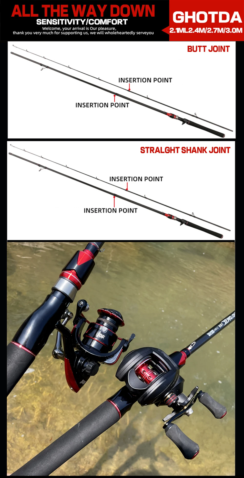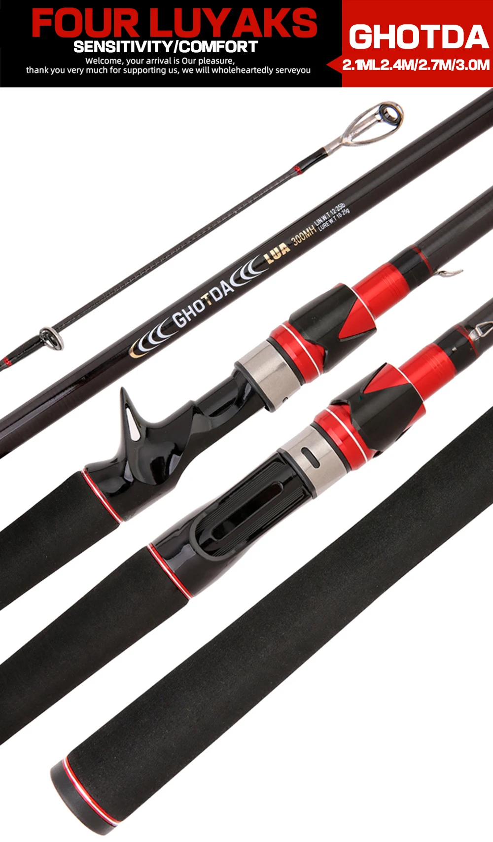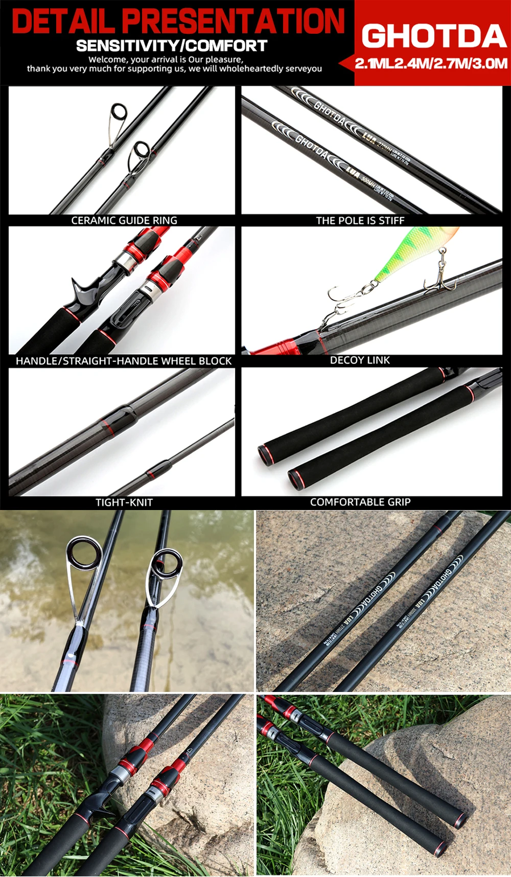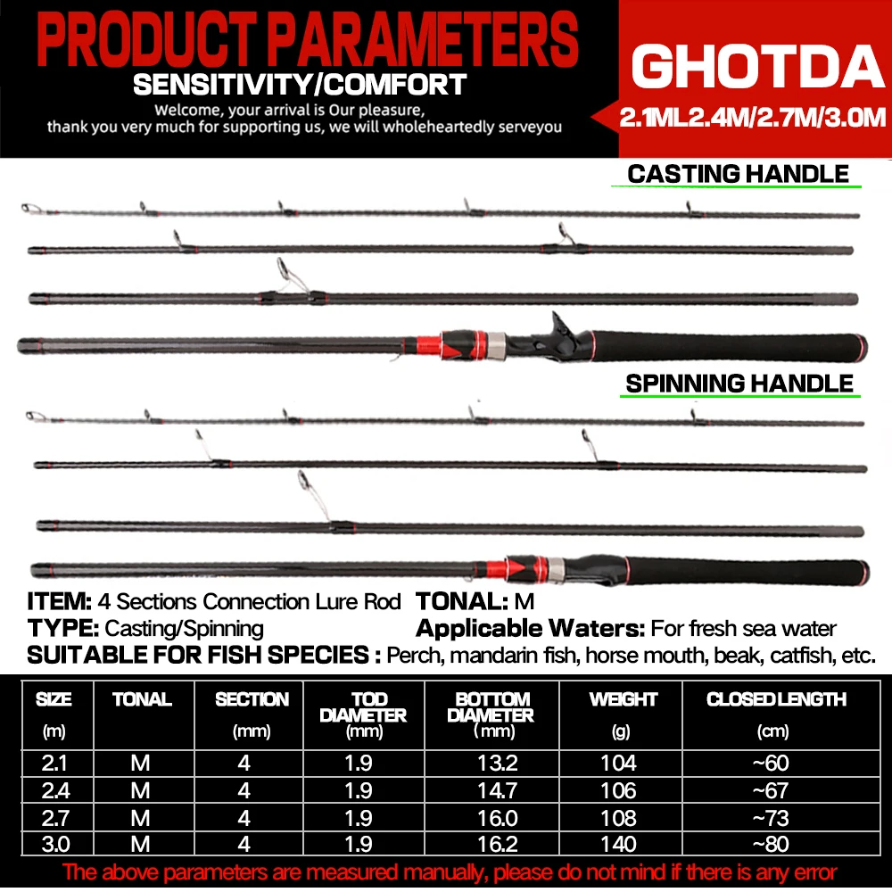 1. Nuestras cañas de pescar han pasado el control de peso de seguridad antes de salir de fábrica. Compra aliviada, por favor.2. Hecho de tela de fibra de carbono de alta elasticidad, con sensación de mano ligera, buena sensación de sujeción y alta resistencia.3. Es más corto y fácil de transportar. La longitud es de 2,1/2,4/2,7/3,0 M. Puede elegir como desee.4. La apariencia está hecha de pintura de alto rendimiento respetuosa con el medio ambiente y marca láser5. Dispositivo colgante de cebo en forma de U de acero inoxidable de alta gama, fácil de usar.6. Adopta un agarre de EVA negro de alta dureza, que es antideslizante y cómodo.El carrete de Baitcasting GS: