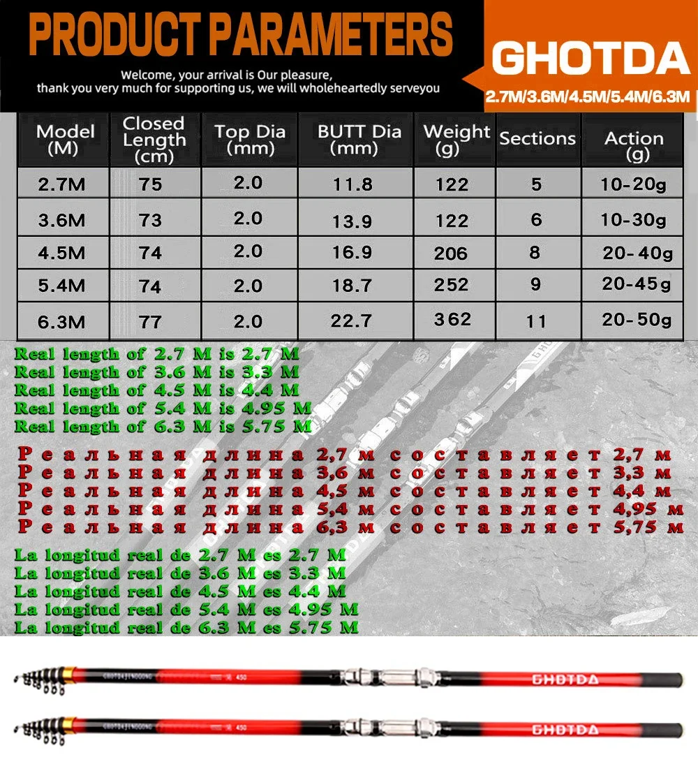 Caña de pescar telescópica ligera y duradera 2,7 M/3,6 M/4,5 M/5,4 M/6,3 M para todos los carretes de pesca Estanque de depósitoPresentamos nuestra caña de pescar en roca de alta calidad hecha con fibra de carbono de primera calidad, ¡perfecta para todas sus aventuras de pesca! Con su diseño giratorio telescópico, esta caña de pescar viene en una gama de tamaños-2,7 M, 3,6 M, 4,5 M, 5,4 M, y 6,3 M, lo que lo hace ideal para su uso en diversos escenarios, incluidos estanques de depósito, océanos y pesca en roca.