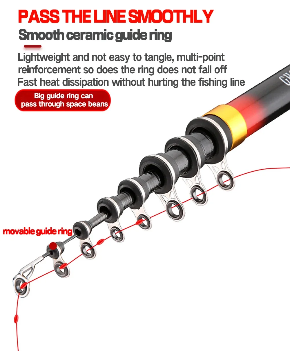 El gran anillo guía puede pasar a través de "granos espaciales" y otras ligaduras para garantizar que la línea de pesca sea flexible y fácilmente maniobrable. Esta caña de pescar viene equipada con un anillo guía móvil que gira suavemente, evitando daños en el sedal. Además, la tapa de protección de la Guía garantiza que el anillo de guía de la varilla no sea susceptible a lesiones o daños. ¡Compre esta fantástica caña de pescar y experimente la emoción de la pesca como nunca antes!