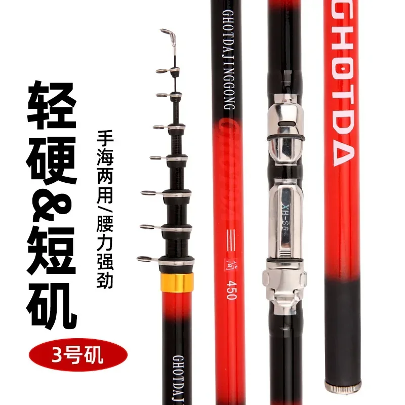 Caña de pescar telescópica ligera y duradera 2,7 M/3,6 M/4,5 M/5,4 M/6,3 M para todos los carretes de pesca Estanque de depósitoPresentamos nuestra caña de pescar en roca de alta calidad hecha con fibra de carbono de primera calidad, ¡perfecta para todas sus aventuras de pesca! Con su diseño giratorio telescópico, esta caña de pescar viene en una gama de tamaños-2,7 M, 3,6 M, 4,5 M, 5,4 M, y 6,3 M, lo que lo hace ideal para su uso en diversos escenarios, incluidos estanques de depósito, océanos y pesca en roca.