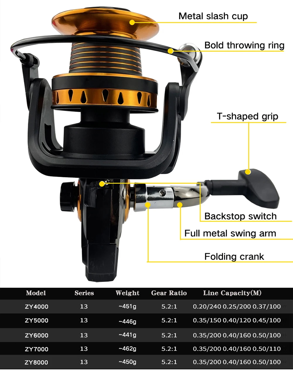 Básicos de informaciónTipo de carrete: carrete de SurfcastingSerie: 4000, 5000, 6000, 7000, 8000Arrastre máximo: 12 kgCarrete: carrete de metal oblicuo de gran capacidad, lanzado más lejosMango: forma de T, más cómodo al girarBrazo de roca: intercambiable izquierda y derechaAsiento del carrete: todo de metalRelación de transmisión: 5,2: 1Características1. Estructura sin espacio en el interior. El carrete está equipado con un rodamiento unidireccional, no hay puntos vacíos al retroceder, no es fácil de romper.2. Carrete oblicuo. Tiene gran capacidad, se puede lanzar más lejos. Diferentes series de carretes, el tamaño es el mismo, pero con diferente profundidad.3. Anillo fundido atrevido. Tirar más lejos sin dañar la línea.4. Diseño tallado hueco. Retire el exceso de material, la pesca es más ligera.Crisol de grafito mini horno de oro de la antorcha de fusión del metal1 ud. x carrete de pesca