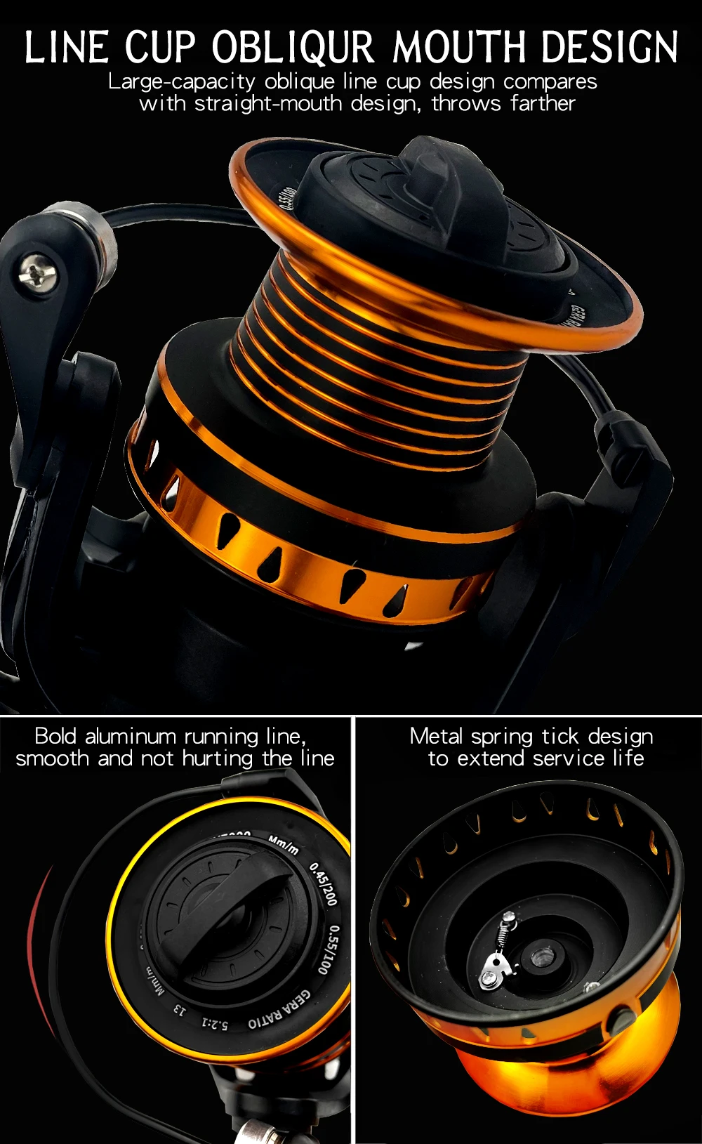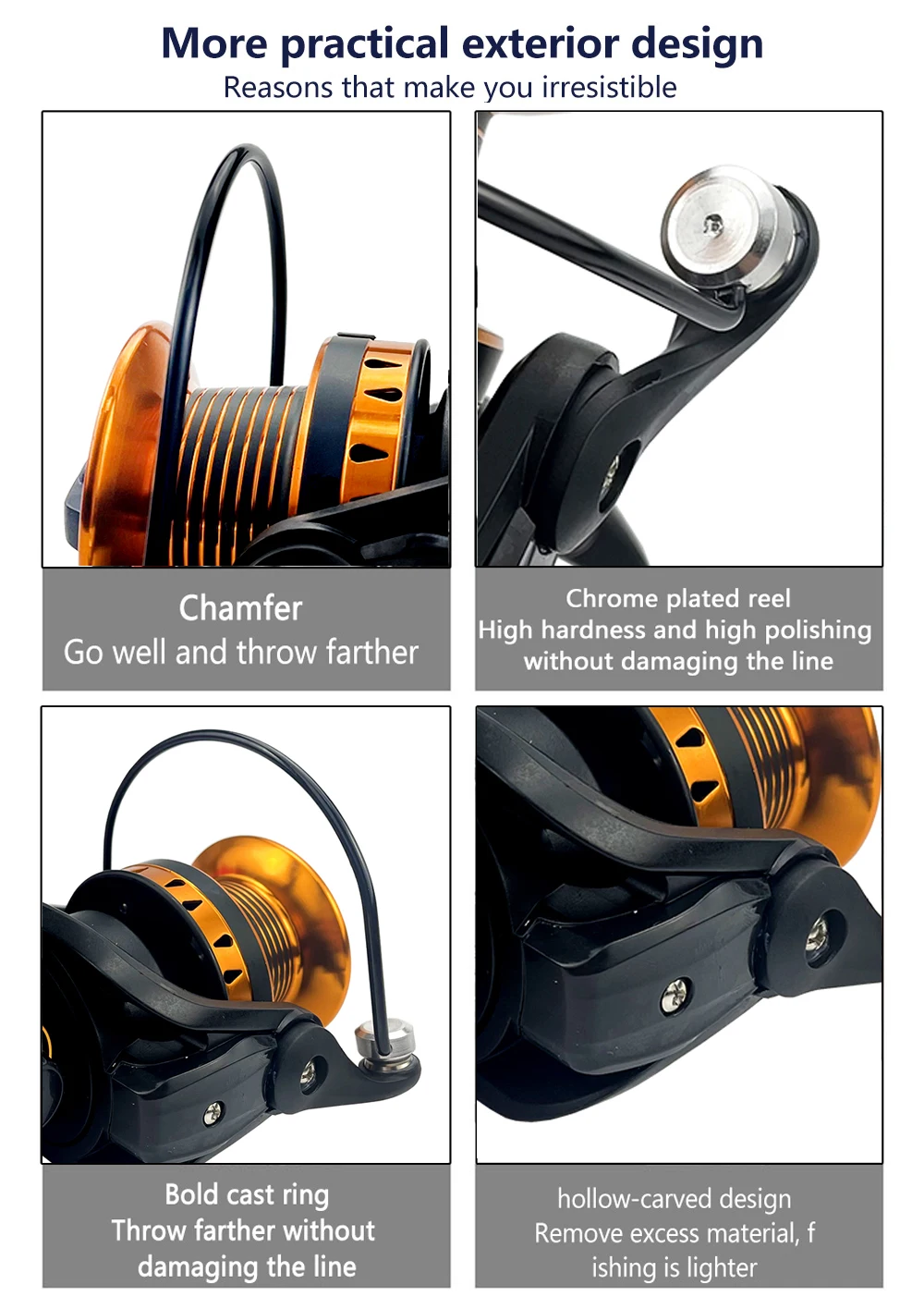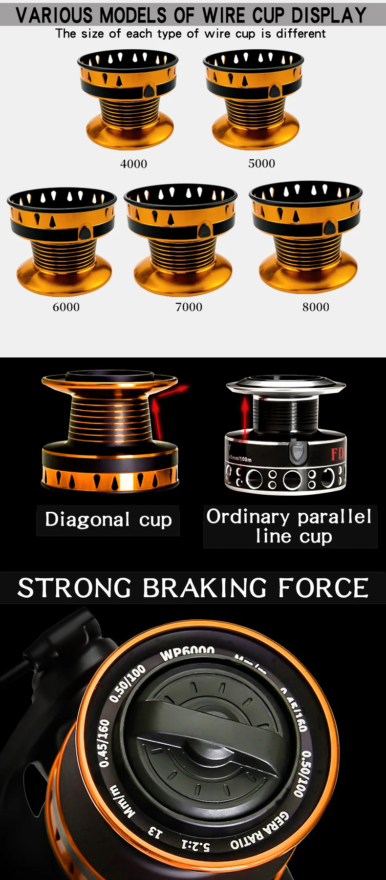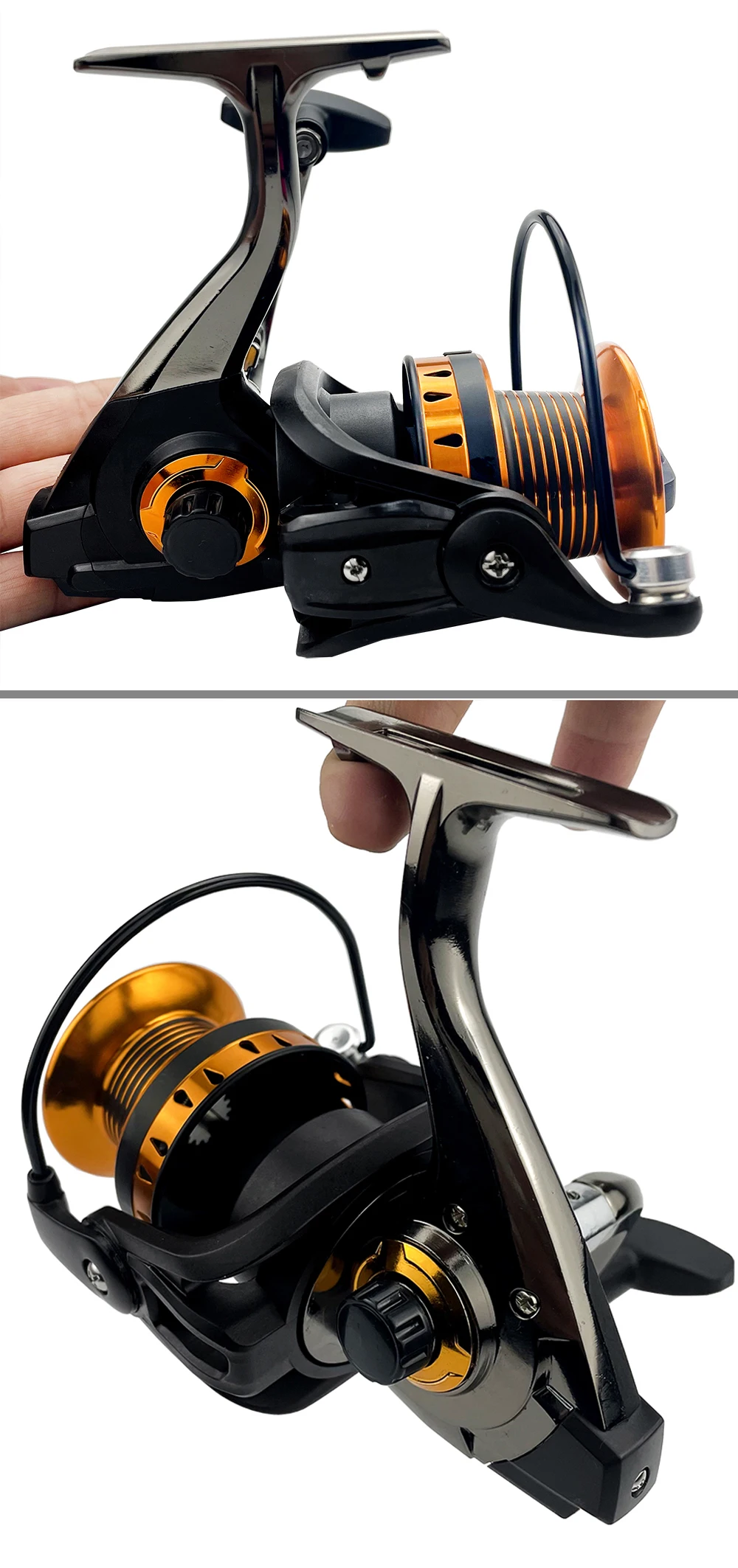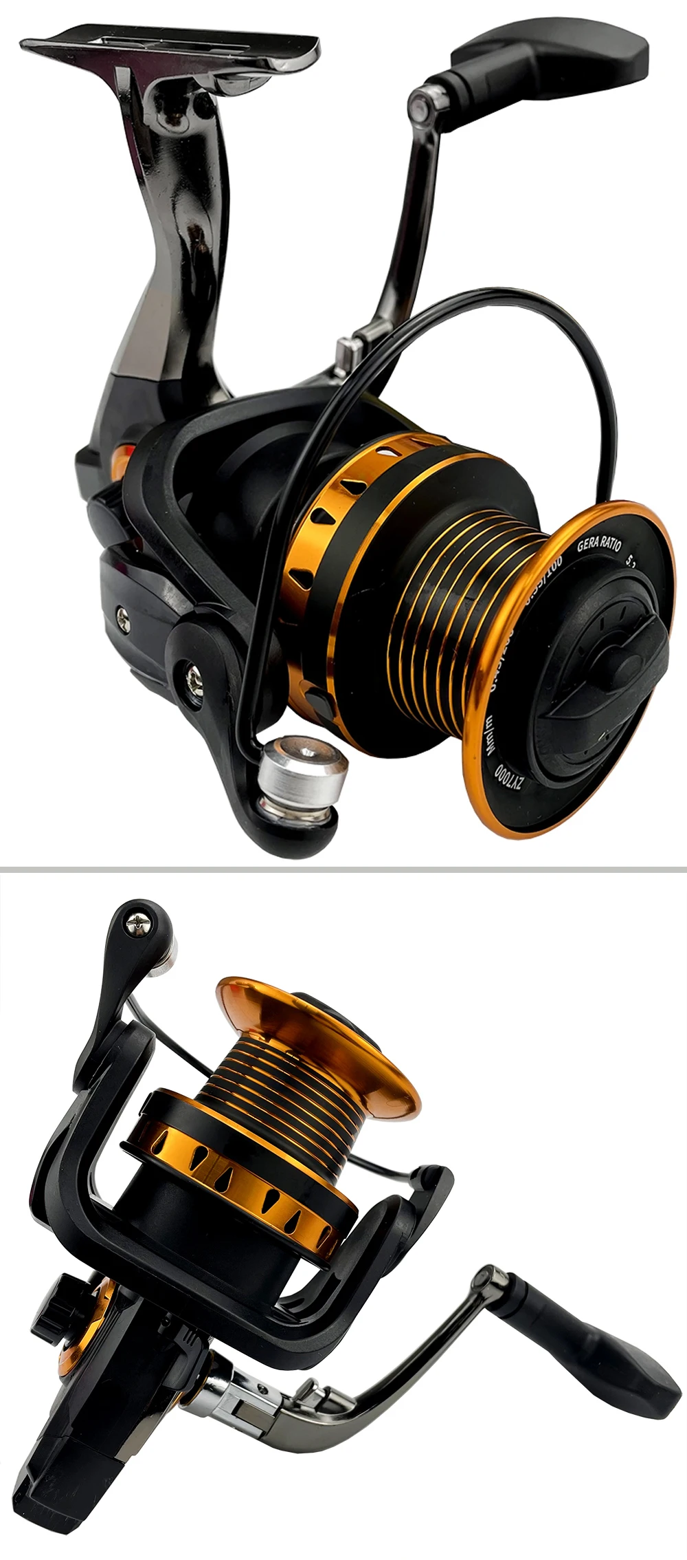 Básicos de informaciónTipo de carrete: carrete de SurfcastingSerie: 4000, 5000, 6000, 7000, 8000Arrastre máximo: 12 kgCarrete: carrete de metal oblicuo de gran capacidad, lanzado más lejosMango: forma de T, más cómodo al girarBrazo de roca: intercambiable izquierda y derechaAsiento del carrete: todo de metalRelación de transmisión: 5,2: 1Características1. Estructura sin espacio en el interior. El carrete está equipado con un rodamiento unidireccional, no hay puntos vacíos al retroceder, no es fácil de romper.2. Carrete oblicuo. Tiene gran capacidad, se puede lanzar más lejos. Diferentes series de carretes, el tamaño es el mismo, pero con diferente profundidad.3. Anillo fundido atrevido. Tirar más lejos sin dañar la línea.4. Diseño tallado hueco. Retire el exceso de material, la pesca es más ligera.Crisol de grafito mini horno de oro de la antorcha de fusión del metal1 ud. x carrete de pesca