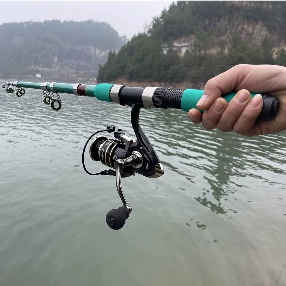 1. Esta caña de pescar está hecha de fibra de carbono, fuerte y duradera.