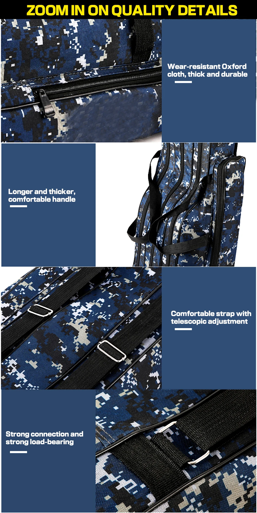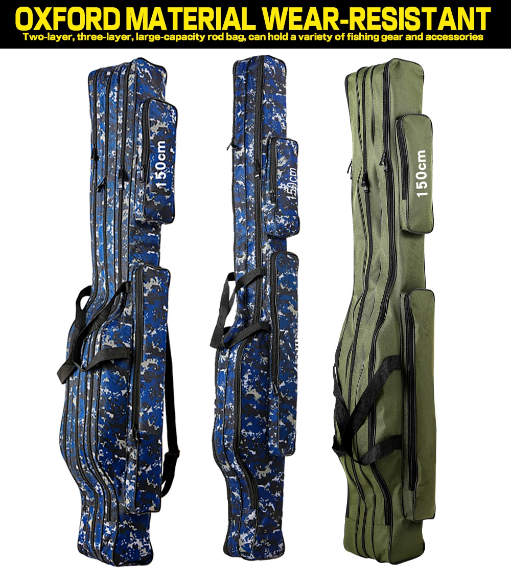Features Made of canvas, water-resistant and wear-resistant, very durable. It contains two or three main compartments with side pouches. Large capacity and adjustable straps, convenient and portable. Wonderful companion for anglers. Specifications Material: 1280D Canvas Color: Green / Blue (optional) Layer: Two / Three (optional) Length: 110cm / 120cm / 130cm / 150cm (optional) Package List 1pc * Fishing Bag
