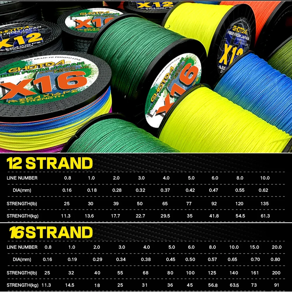 GHOTDA-líneas de pesca trenzadas de 12/16 hebras, Sedal multifilamento de 100M, 300M, 25-200LB para pesca en mar, carpa, Océano, barco/Roca, 0,16-0,8mm