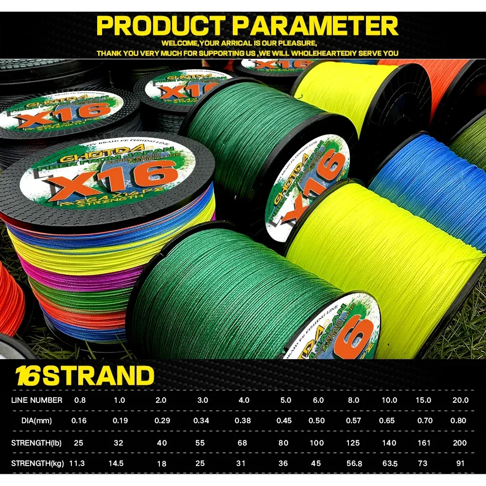 El sedal trenzado de 16 hebras está disponible en 25LB-200LB. Esta línea de pesca es perfecta para todas sus necesidades de pesca, desde la pesca en aguas profundas hasta la pesca en agua dulce. Mejore su experiencia de pesca hoy con esta línea de pesca única y de alta calidad, que seguramente superará sus expectativas.