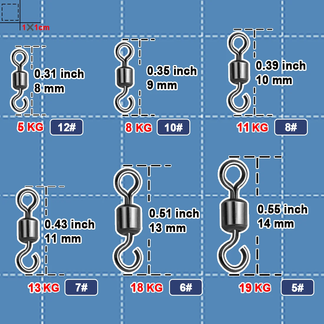 Adecuado para uso de pesca múltiple: los eslabones giratorios de pesca son aplicables para varios tipos de pesca, como la pesca en agua salada, la pesca en agua dulce, la pesca en tierra y la pesca en alta mar. Ofrecemos varios tamaños para su elección. Y la fuerza de estos giratorios a presión es diferente de 5kg a 19kg. Estos tamaños satisfacen sus necesidades para diferentes usos. Confirme sus tamaños adecuados antes de comprarlo. Le brinda la mejor experiencia.
