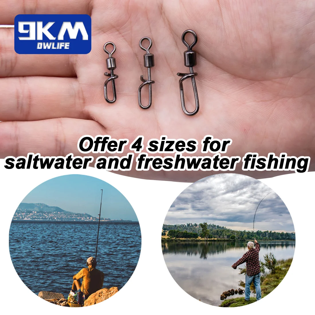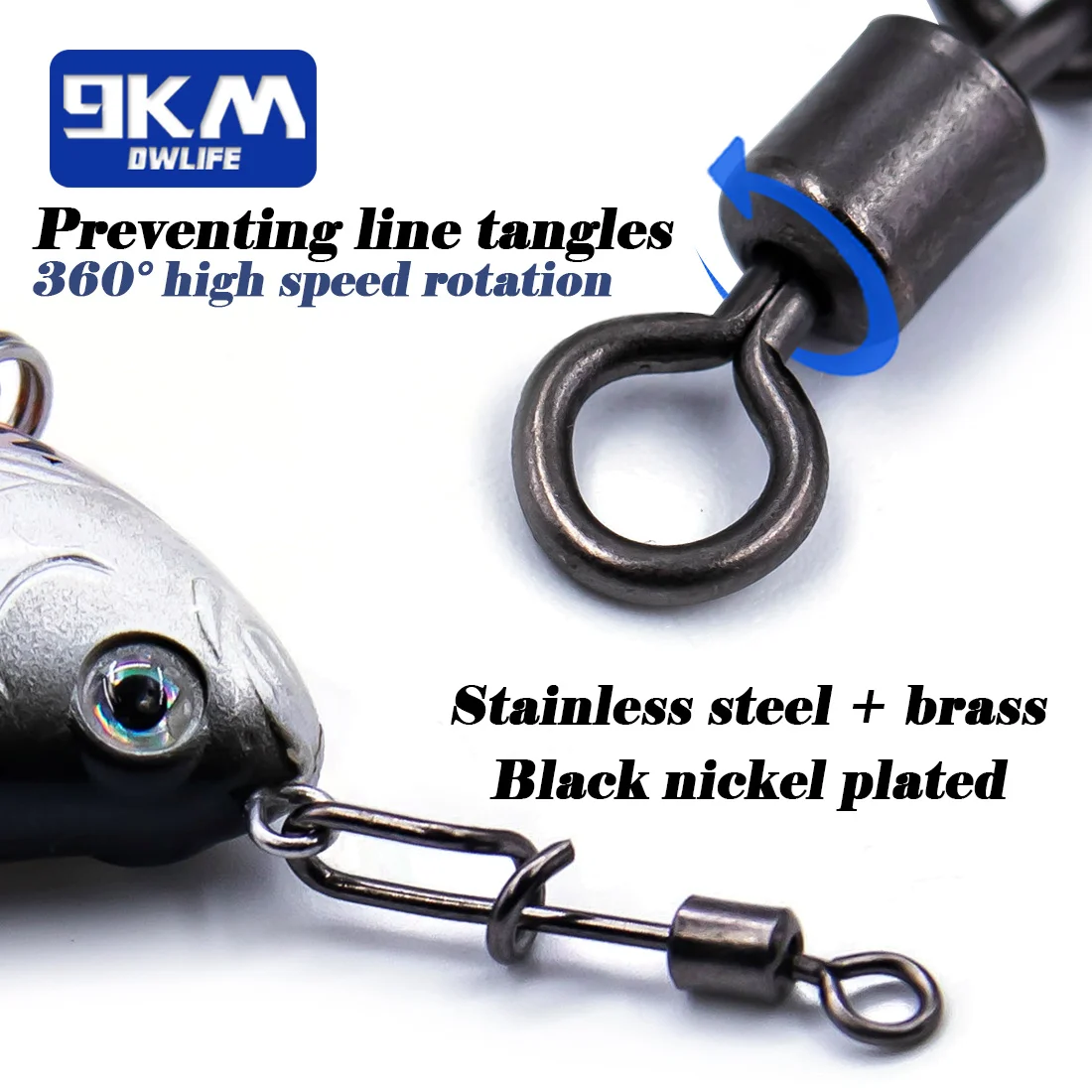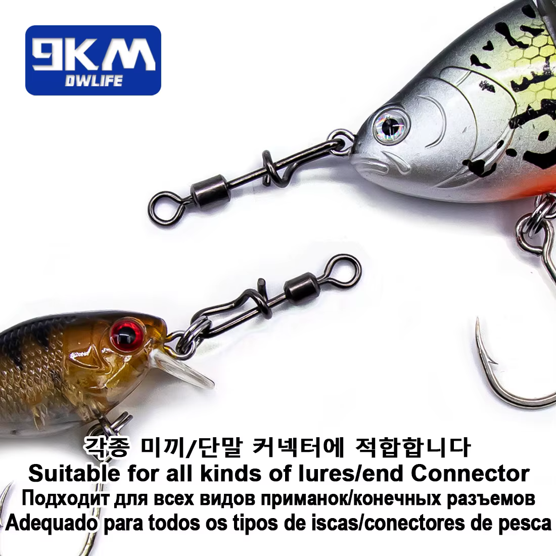 Snap is directly connected to roller : makes the fishing swivel smaller and lighter. Unrestricted high-speed rotation of the Rolling swivel prevents the bait rig from twisting allow the bait to present more natural actions in water and reduces the dragging force from fish to protect fishing tackles.Free and independent rotation make the fishing lures more attractive.