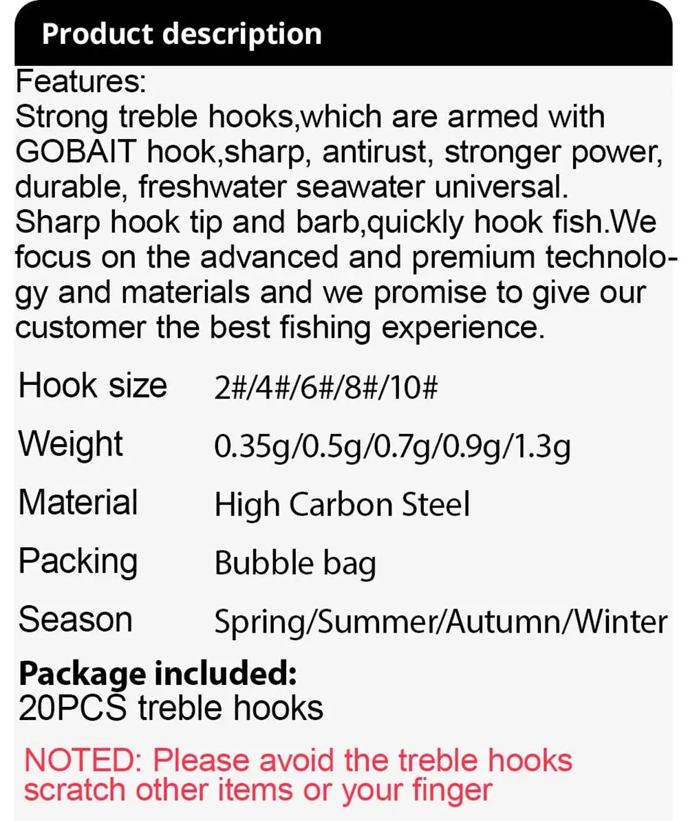 • Paquete de 20 :Este paquete contiene 20 anzuelos, lo que le proporciona un amplio suministro para sus aventuras de pesca.