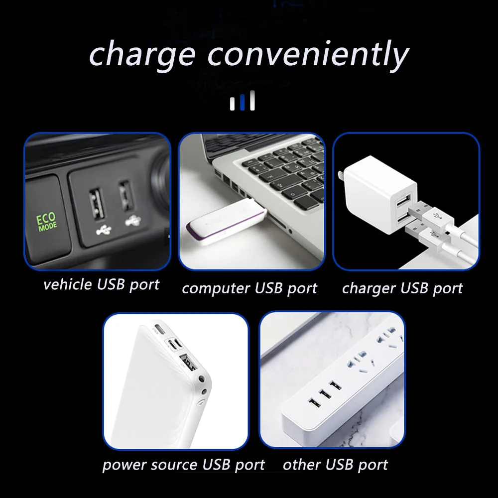 4.Se puede cargar mediante diferentes dispositivos de carga USB (por ejemplo,coche, teléfono móvil, banco de energía, PC, etc.)