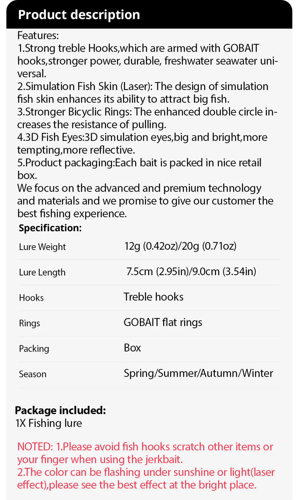 • Uso versátil:Con su rango de peso de 12g a 20g y su tamaño de 7,5 cm a 9cm, este señuelo es versátil y se puede utilizar en diversos entornos y escenarios de pesca.