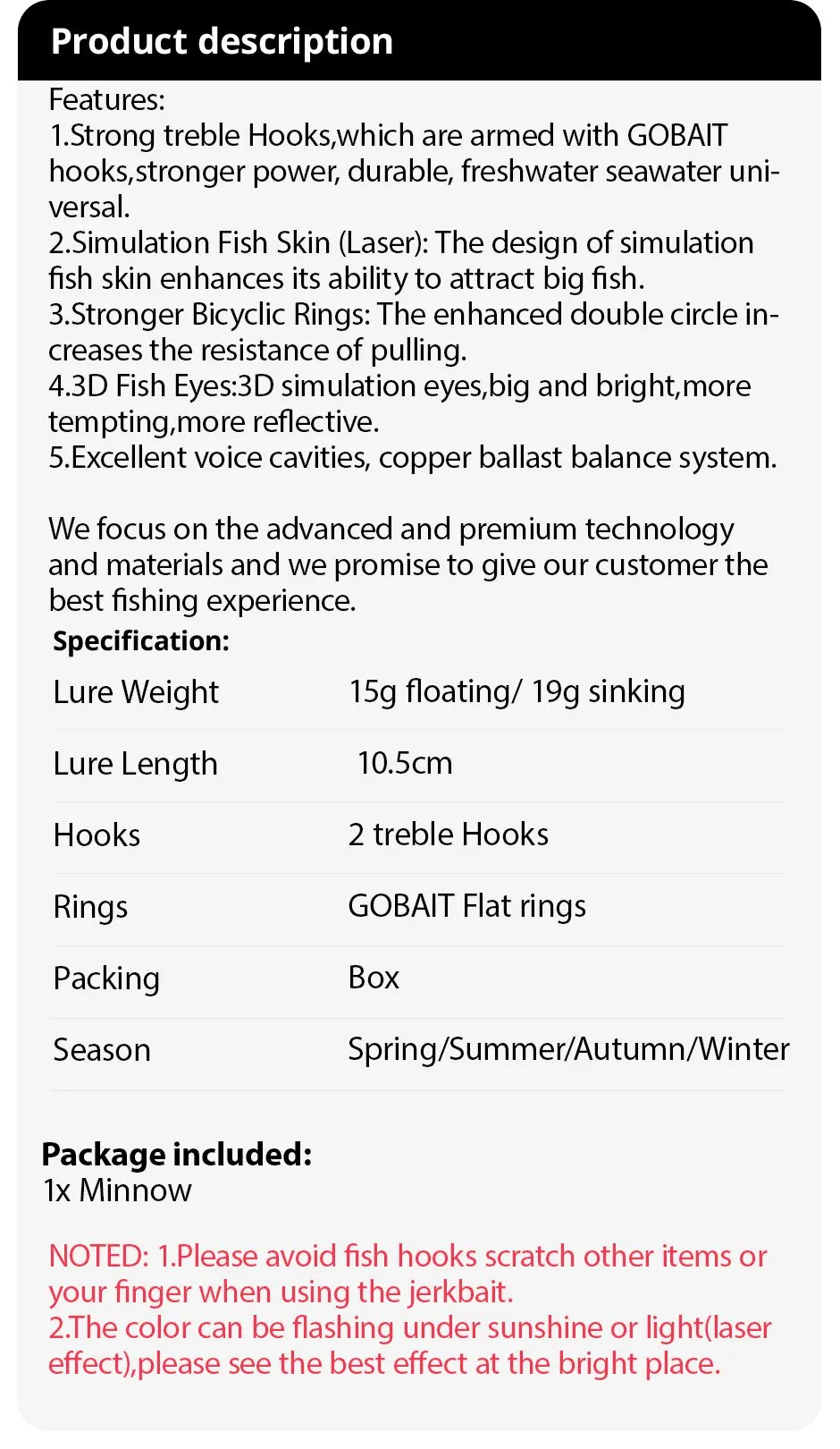 1. Ganchos triples fuertes, que están armados con ganchos GOBAIT, potencia más fuerte, duradero, agua de mar de agua dulce universal.