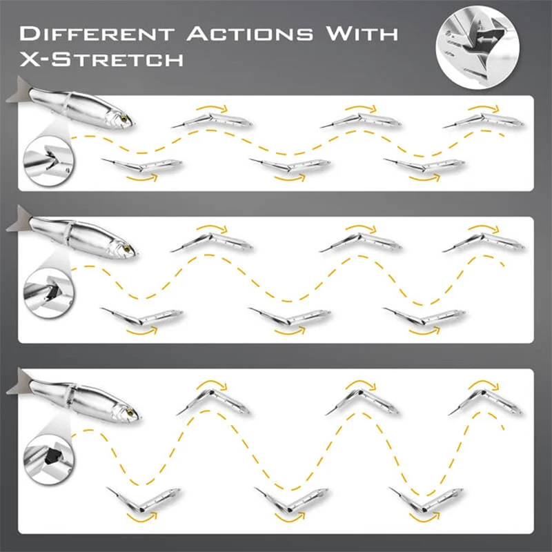 DISEÑO PATENTADO ORIGINAL: Con el Diseño variable de doble sección "X-stretch", las secciones delantera y trasera del cebo de natación pueden tener tres longitudes de espaciado diferentes y tres ángulos de flexión diferentes, que puede traer diferentes estilos de natación.