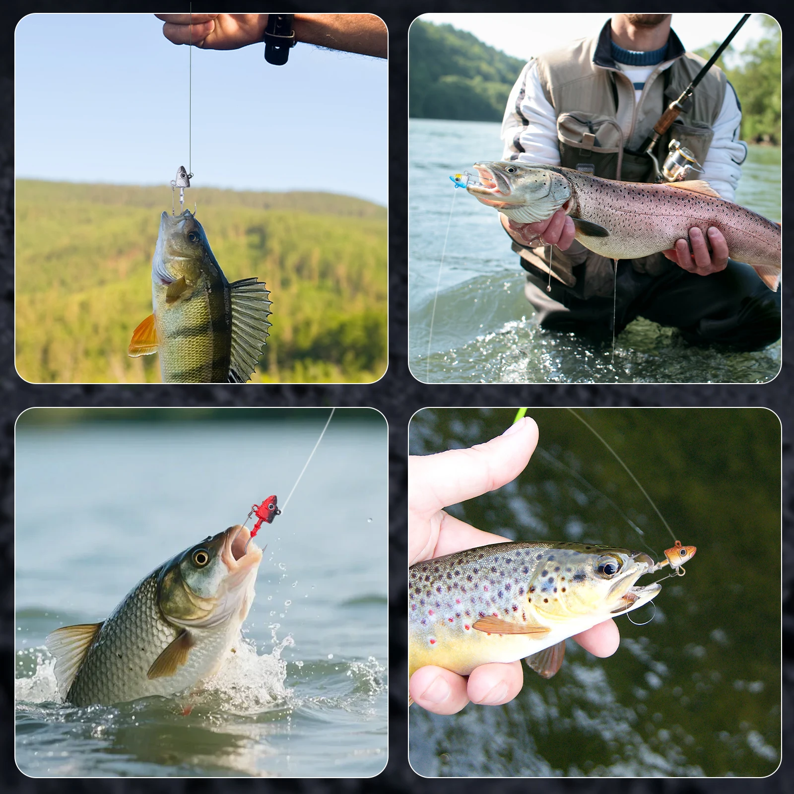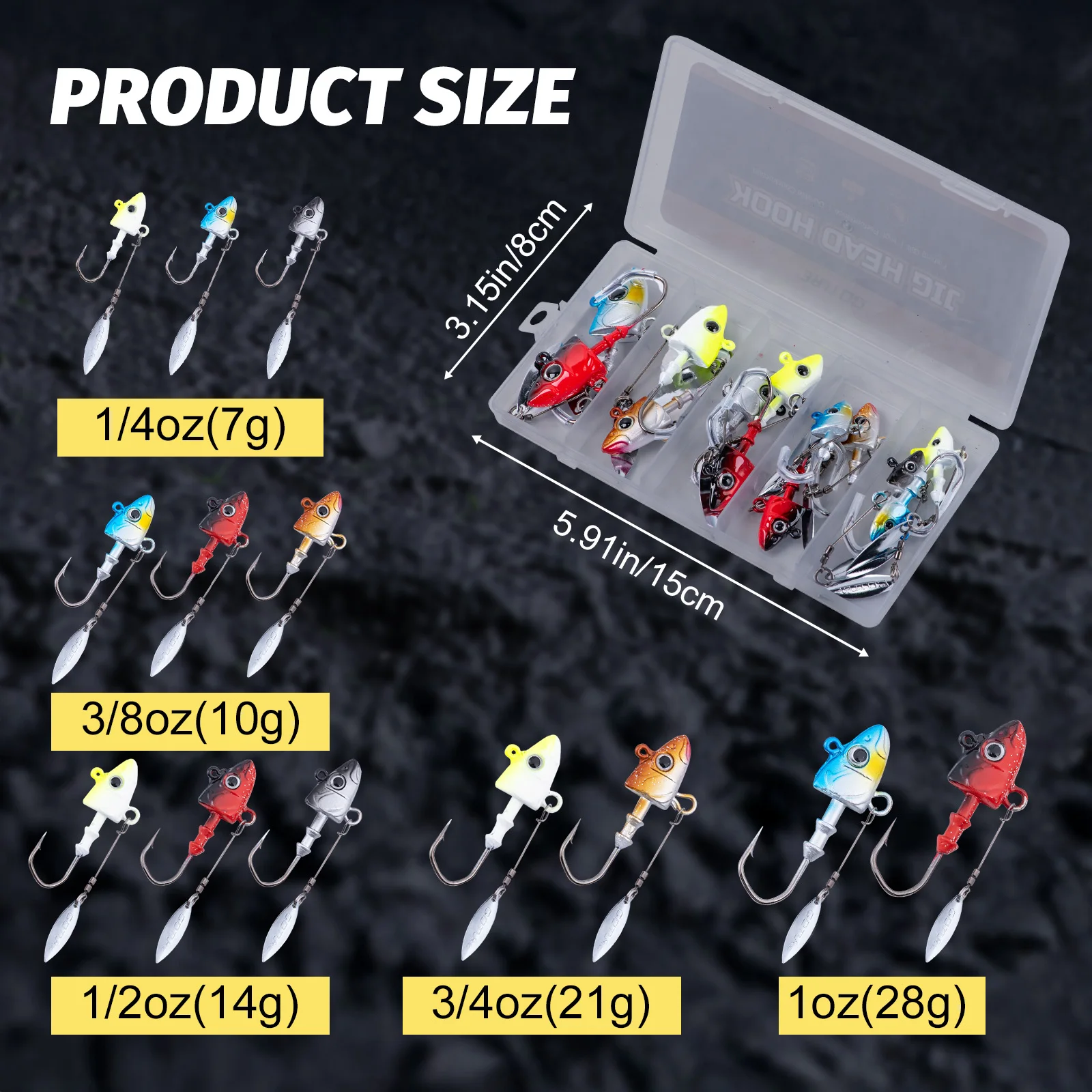 Hoeveelheid: 5 stuks Gewicht: 7 g, 10 g, 14 g, 21 g, 28 g, 32 g, 38 g Kleur: Rood/Zwart, Blauw/wit, Geel/wit, Roze/wit, Zilver Model: Worm Jig hoofdhaak Materiaal: loodmalkop, haak van koolstofstaal Opmerking: het gewicht heeft ongeveer 0-3 g fouten, maak je daar geen zorgen over. bedankt